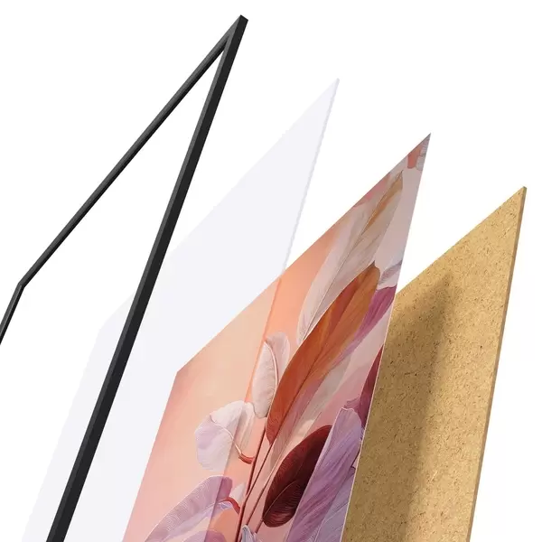 Plagát sa skladá z rámu, plexiskla, vytlačeného obrazu a podkladu z drevotriesky. Plagát možno okamžite zavesiť na stenu vďaka úchytom na zadnej strane.