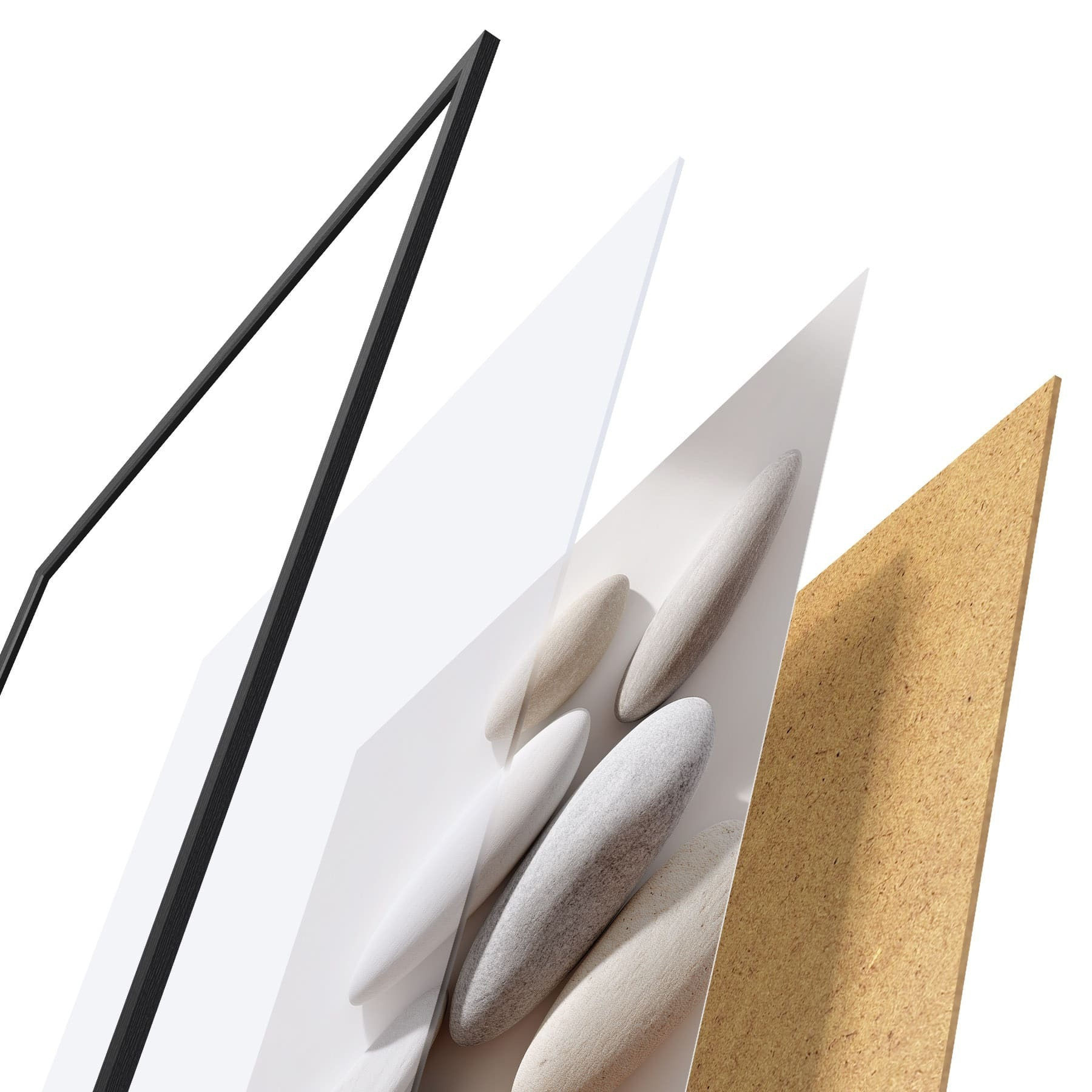 Plagát sa skladá z rámu, plexiskla, vytlačeného obrazu a podkladu z drevotriesky. Plagát možno okamžite zavesiť na stenu vďaka úchytom na zadnej strane.