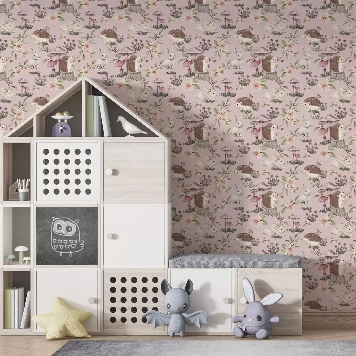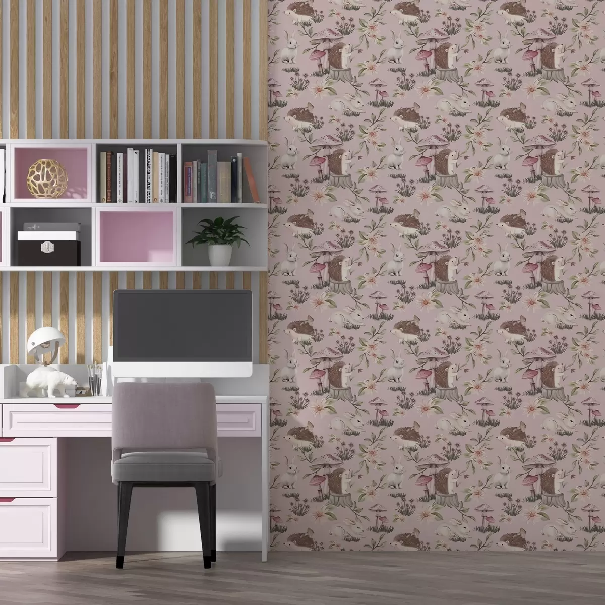 Tapeta Ježkovia v rozprávkovom štýle, zajace a kvety medzi hubami na ružovom pozadí Nr. a00111