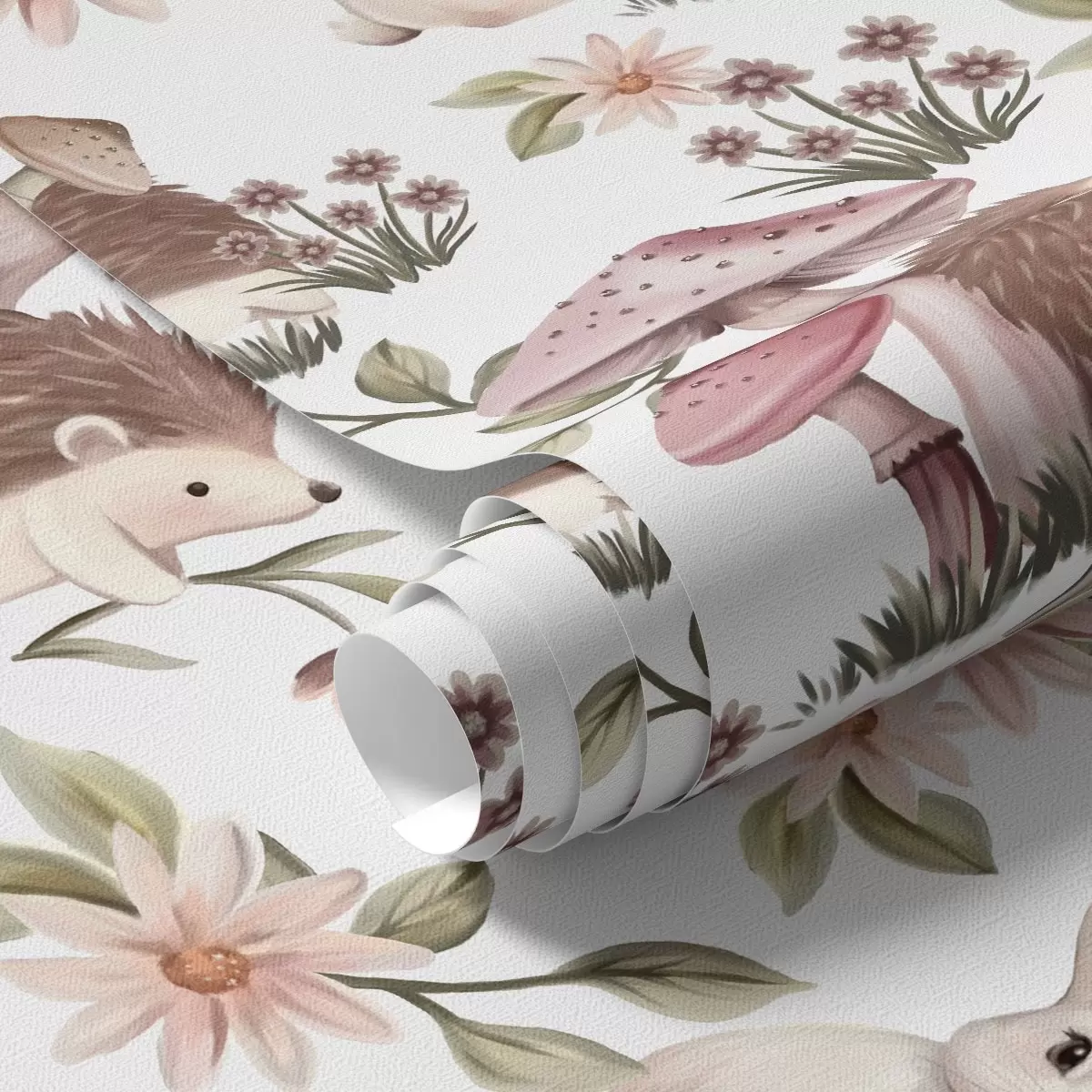 Tapeta Ježkovia a zajace na bielom pozadí s jemnými kvetmi a hubami Nr. a00111v2