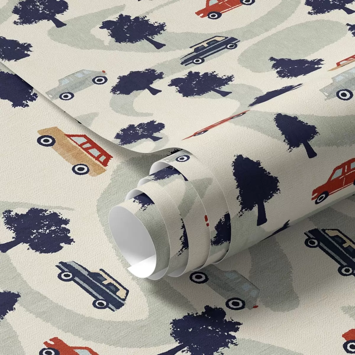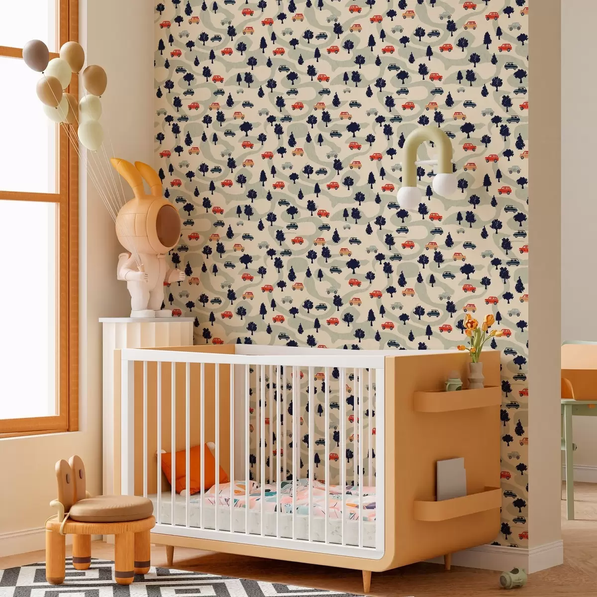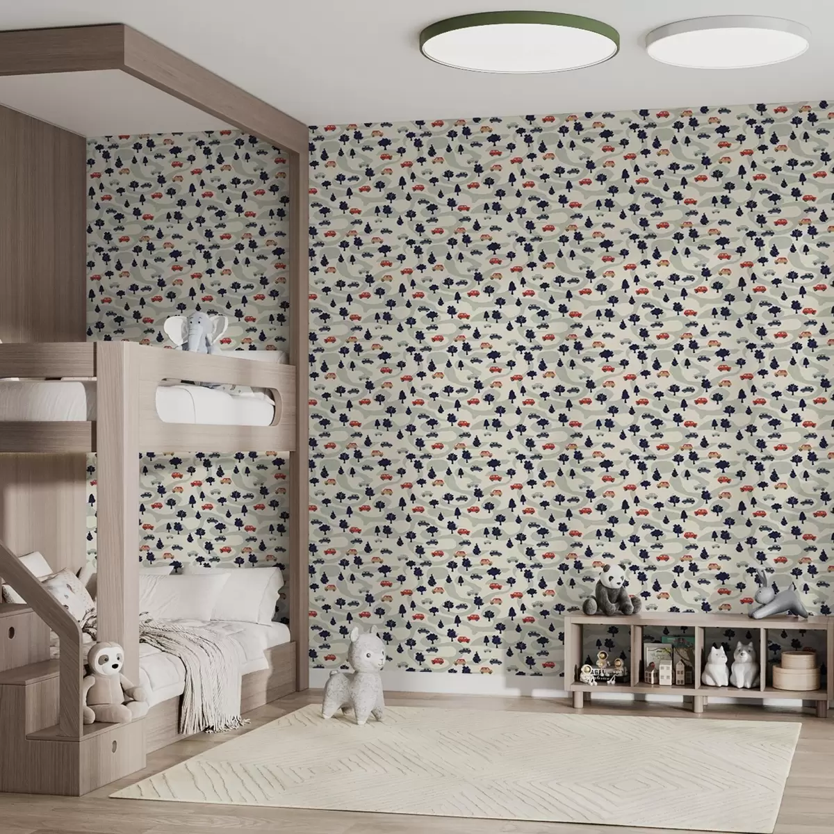 Tapeta Zábavné autá medzi stromami na krémovom pozadí Nr. a00119