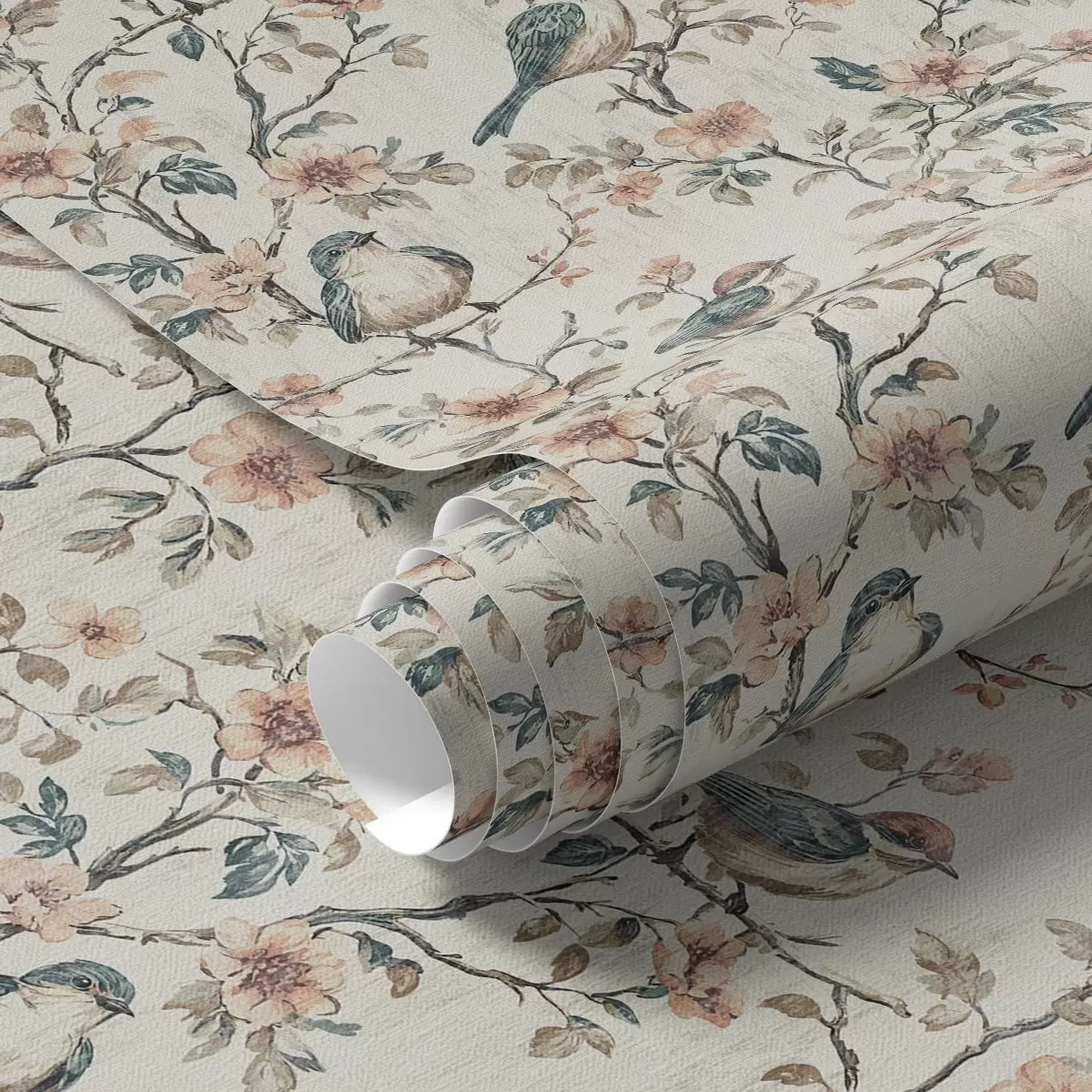 Tapeta Vtáky na konároch s kvetmi v retro akvarelovom štýle Nr. a00197