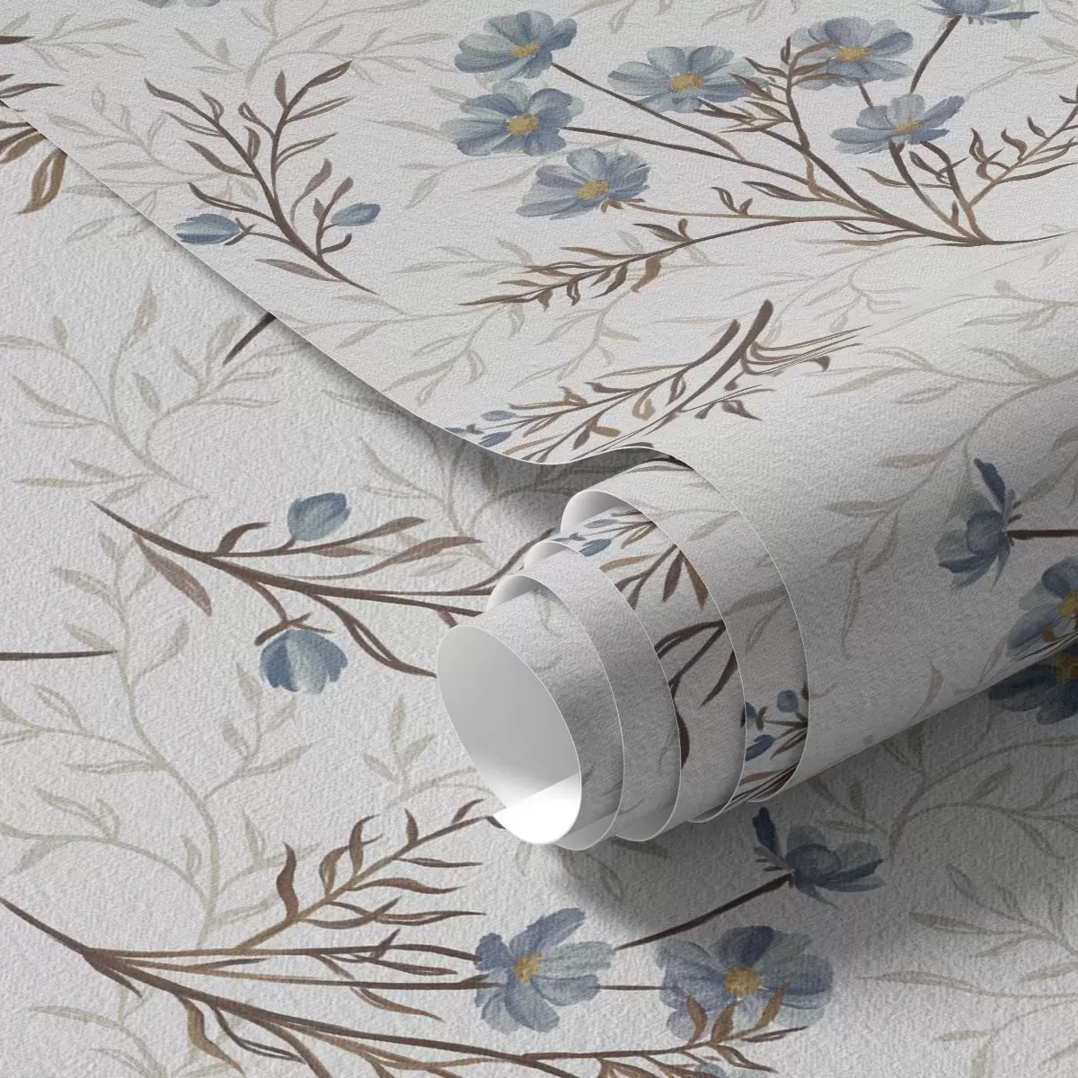 Tapeta Modré kvety a svetlé vetvy na bielom pozadí Nr. a00265v1