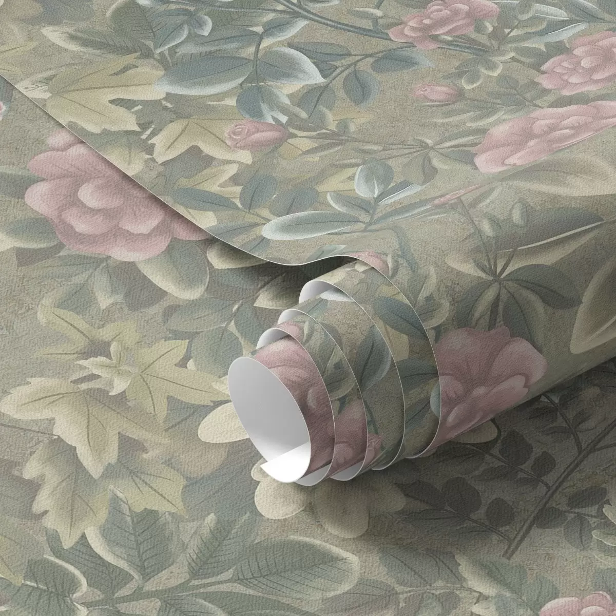 Tapeta Ružové kvety a listy na pastelovo zelenom pozadí Nr. a00306