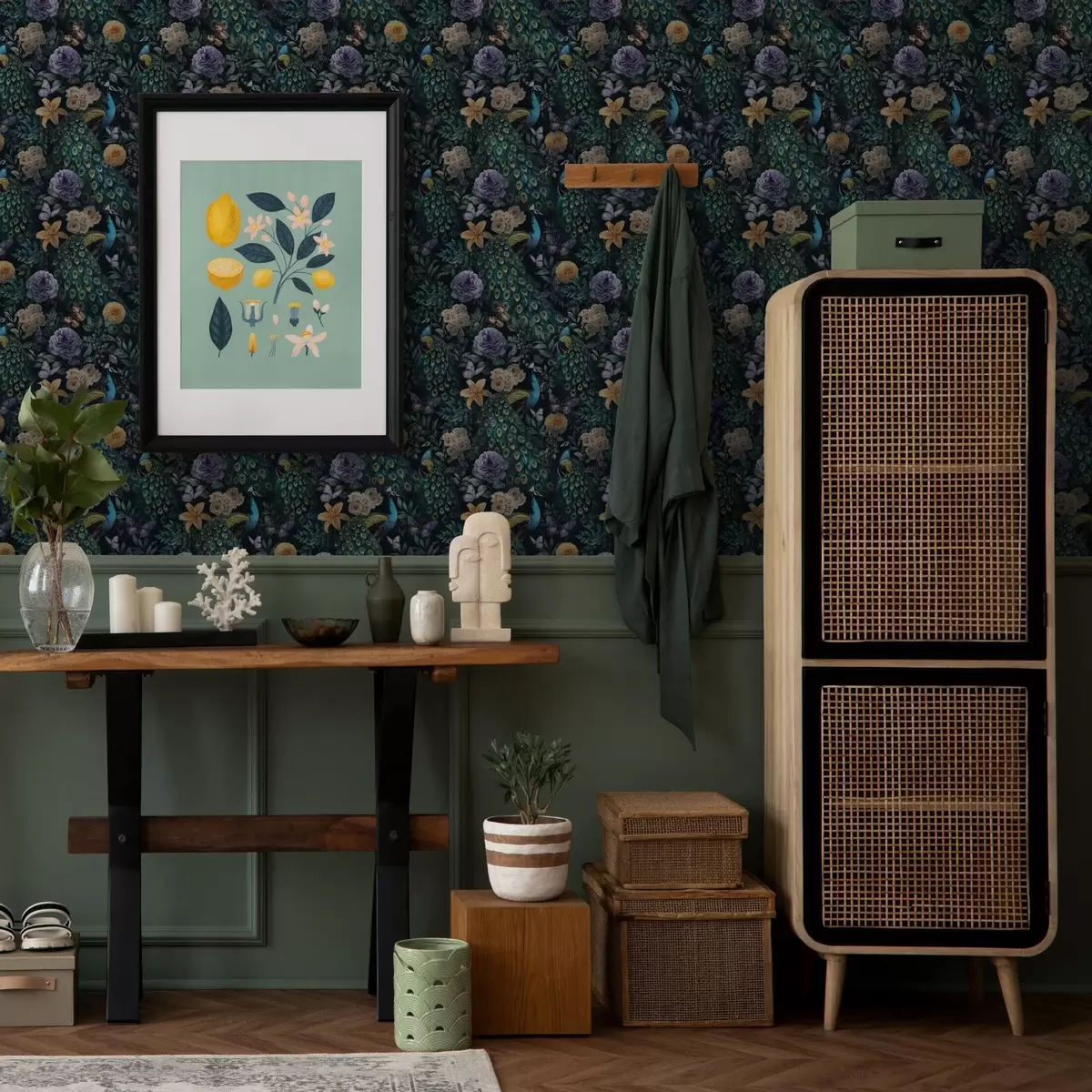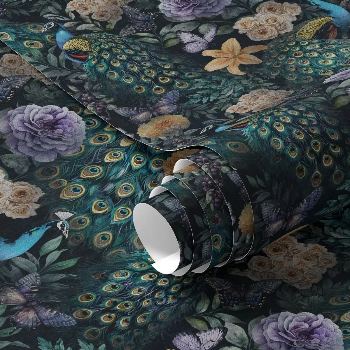 Tapeta Pávy medzi tmavými kvetmi a motýľmi Nr. a00348