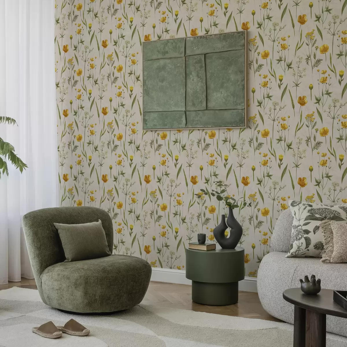Tapeta Žlté kvety a zeleň na béžovom pozadí Nr. a00472v2