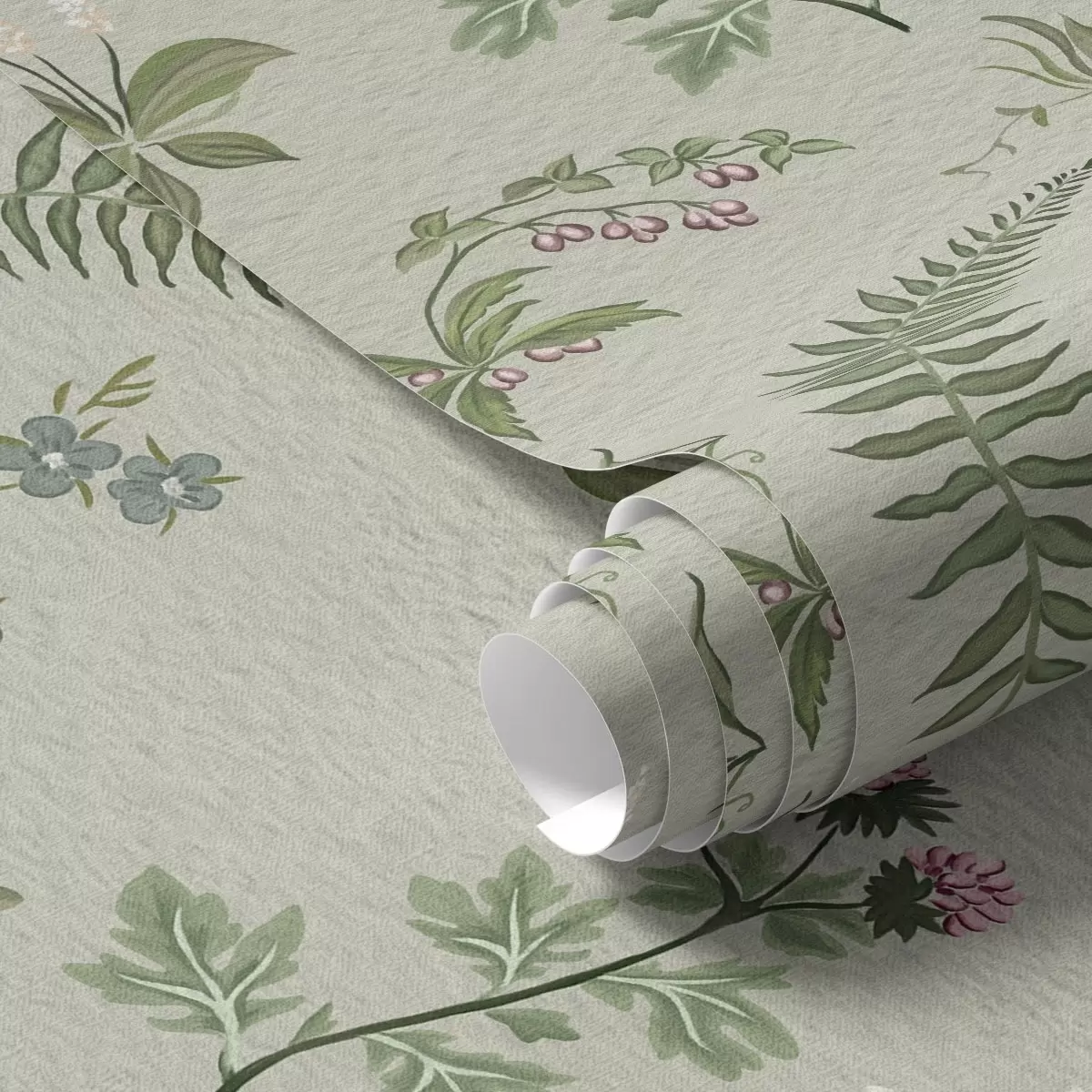 Tapeta Botanické trávy a paprade na bledošedom zelenom podklade Nr. a00498