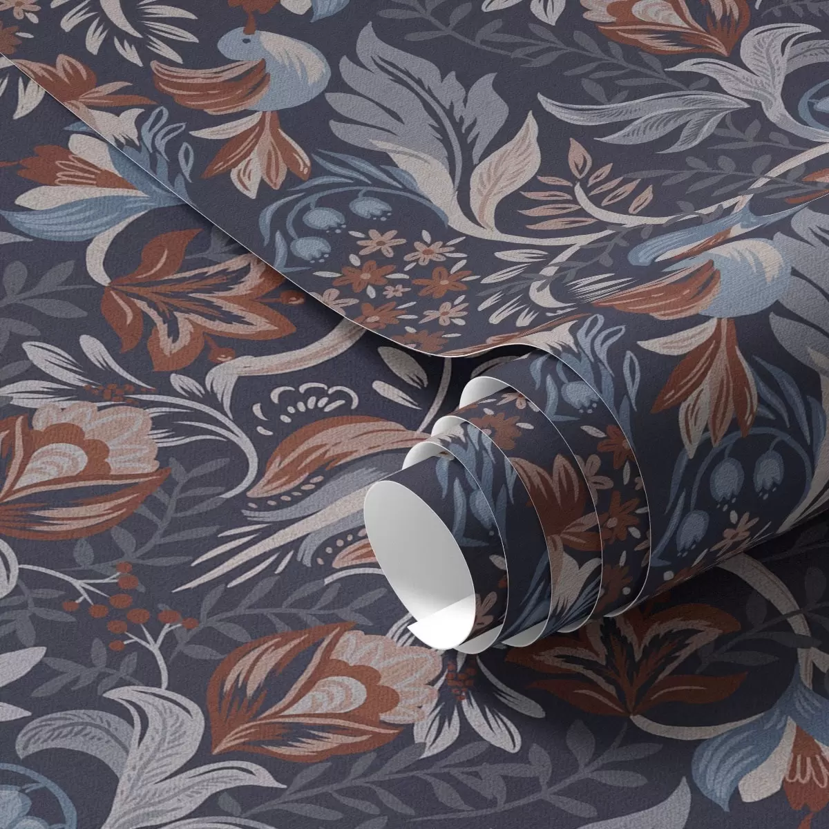 Tapeta Ľudové kvety a vtáky na tmavomodrom pozadí Nr. a00502