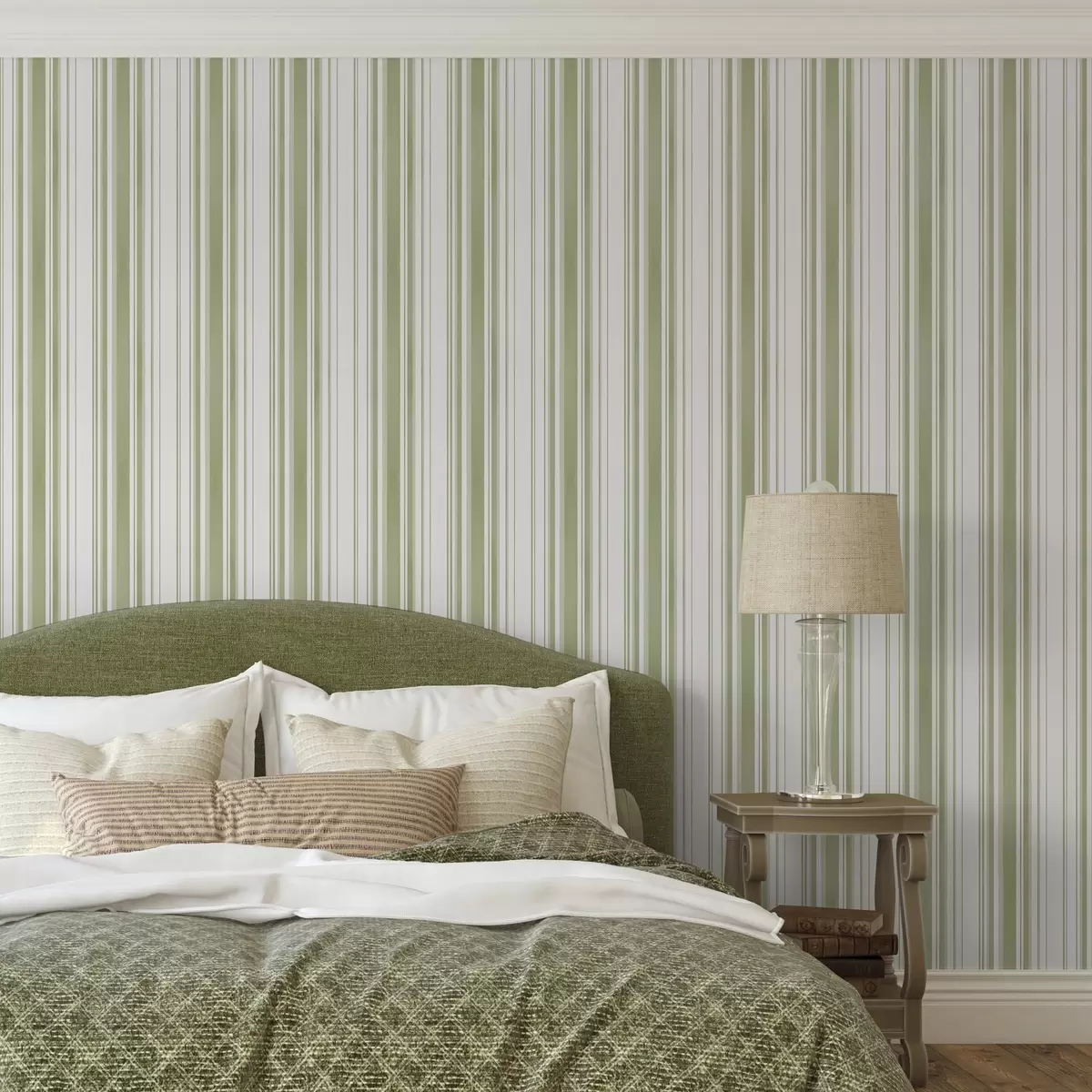 Tapeta Zelené pruhy rôznej šírky na svetlom pozadí Nr. a00523