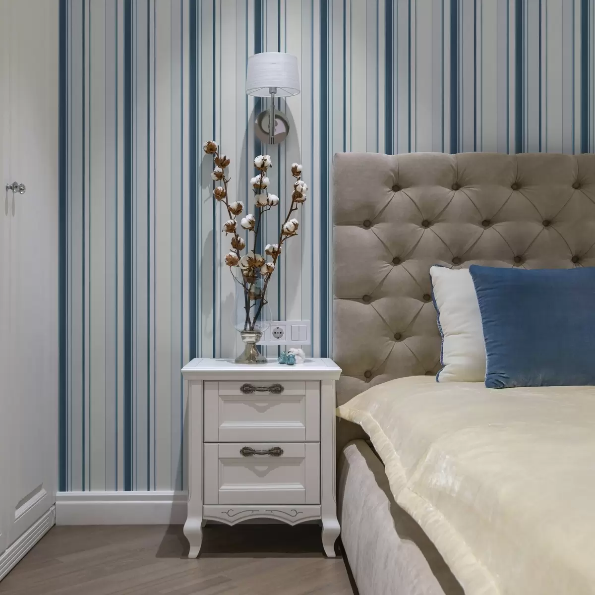 Tapeta Tyrkysové a modré pruhy rôznej šírky na svetlom pozadí Nr. a00530