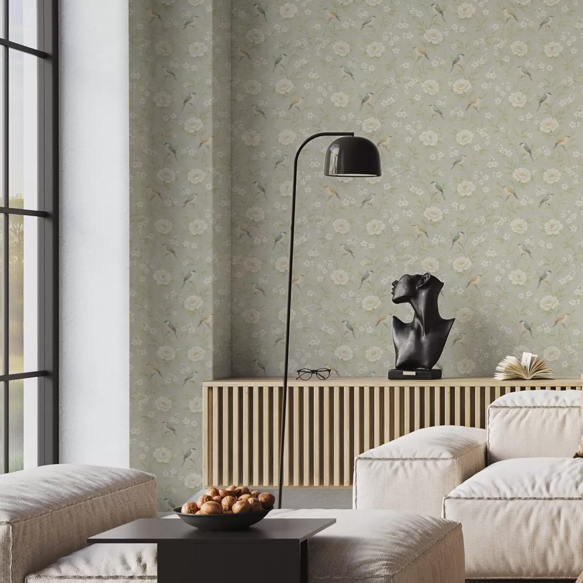Tapeta Vtáky medzi bielymi kvetmi na šedo-zelenom pozadí Nr. a00583