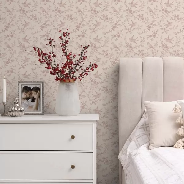 Tapeta Vtáky a ruže, vintage vzor na ružovom pozadí Nr. a00587