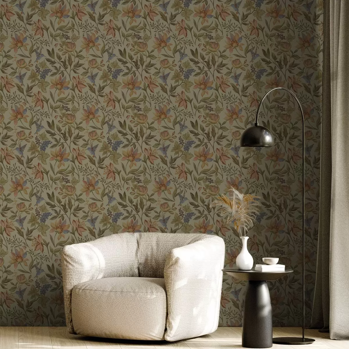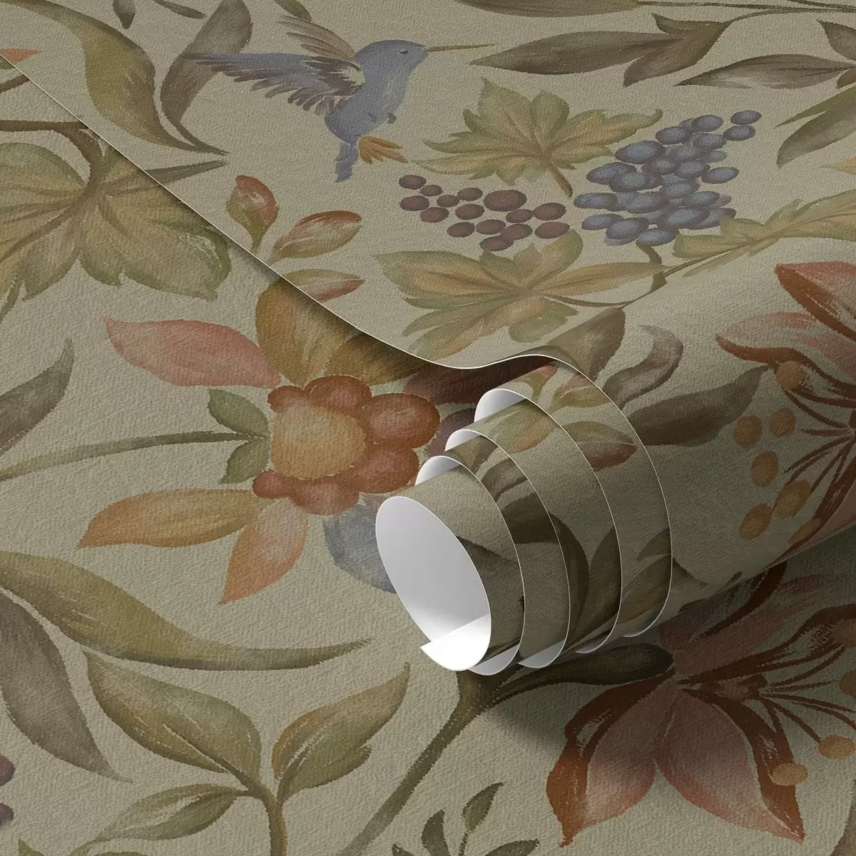Tapeta Vintage kvety a vtáky s hrozienkami na olivovom pozadí Nr. a00594