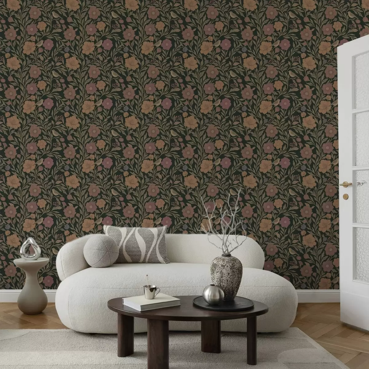 Tapeta Jesenné kvety a vtáky na tmavo zelenom pozadí Nr. a00605v1