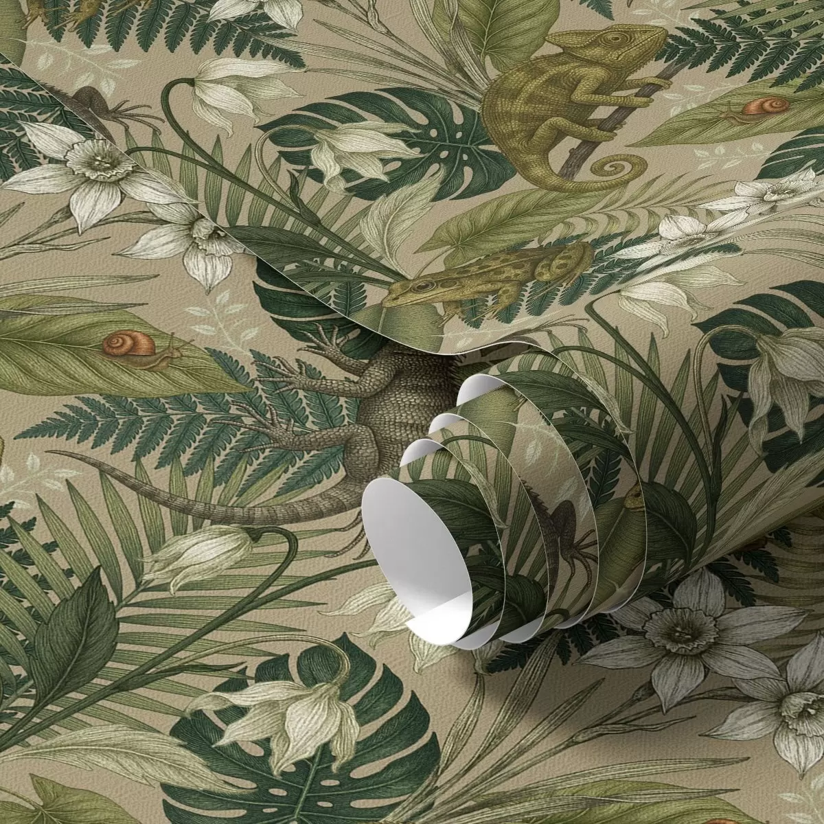 Tapeta Chameleóny a tropické listy, biele kvety, béžový podklad Nr. a00608