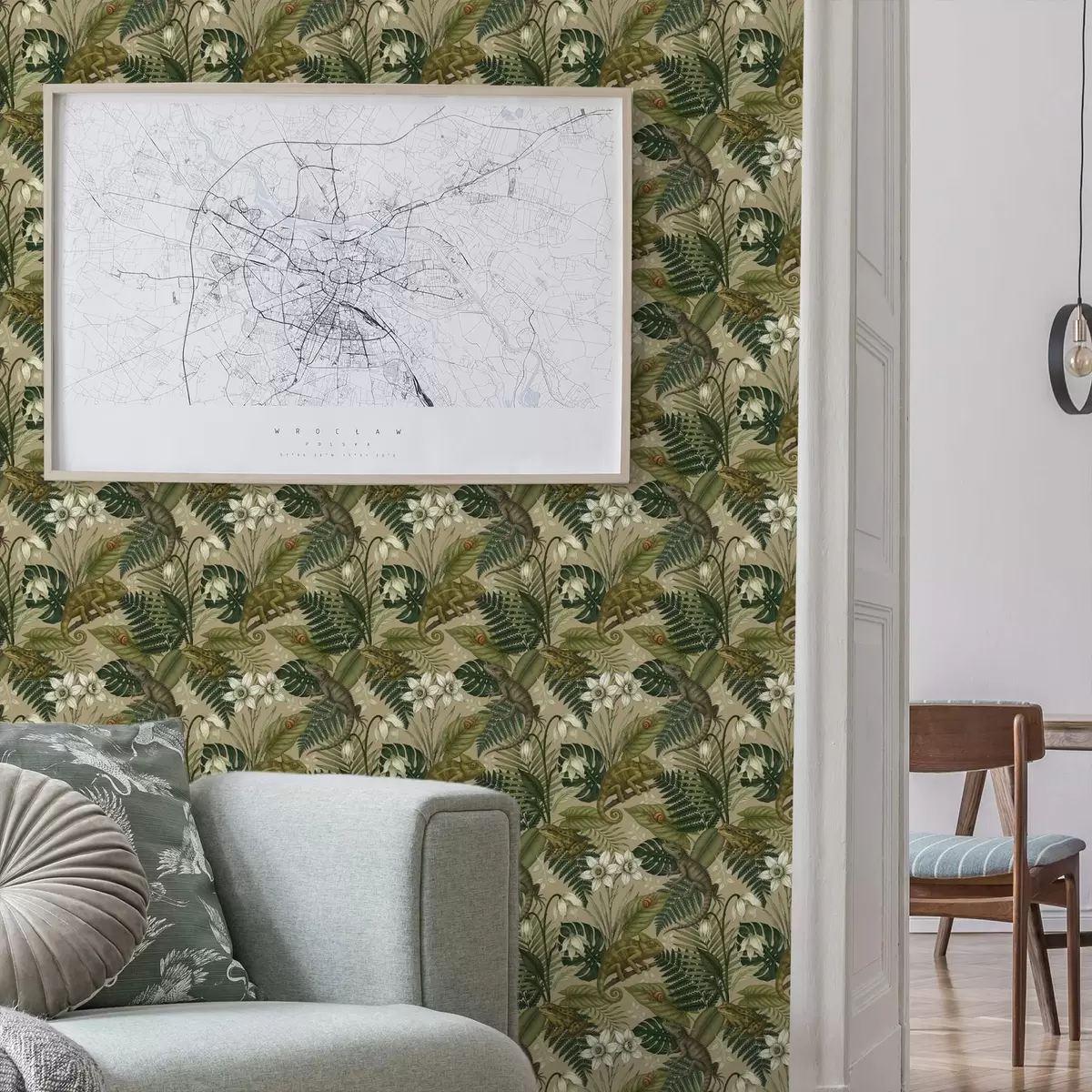 Tapeta Chameleóny a tropické listy, biele kvety, béžový podklad Nr. a00608