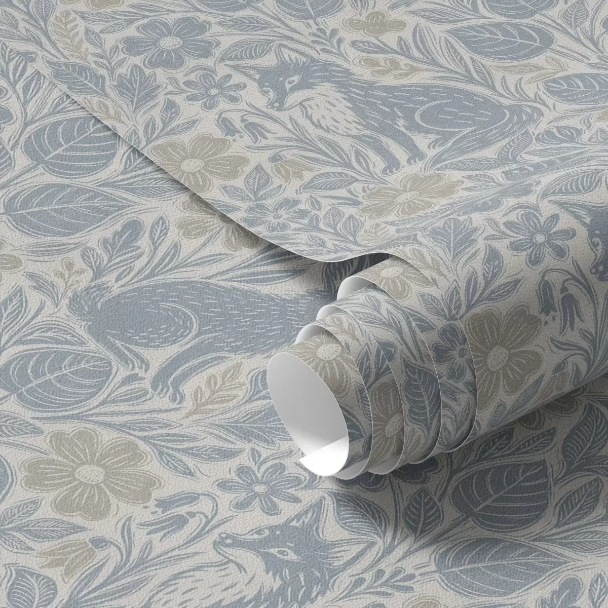Tapeta Lesné zvieratá a kvety: líška a zajac v modrých odtieňoch Nr. a00613