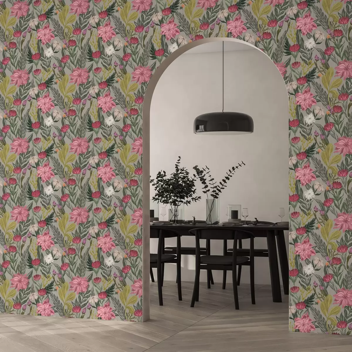 Tapeta Sýte ružové a krémové kvety na sivom pozadí, impasto textúra Nr. a00629
