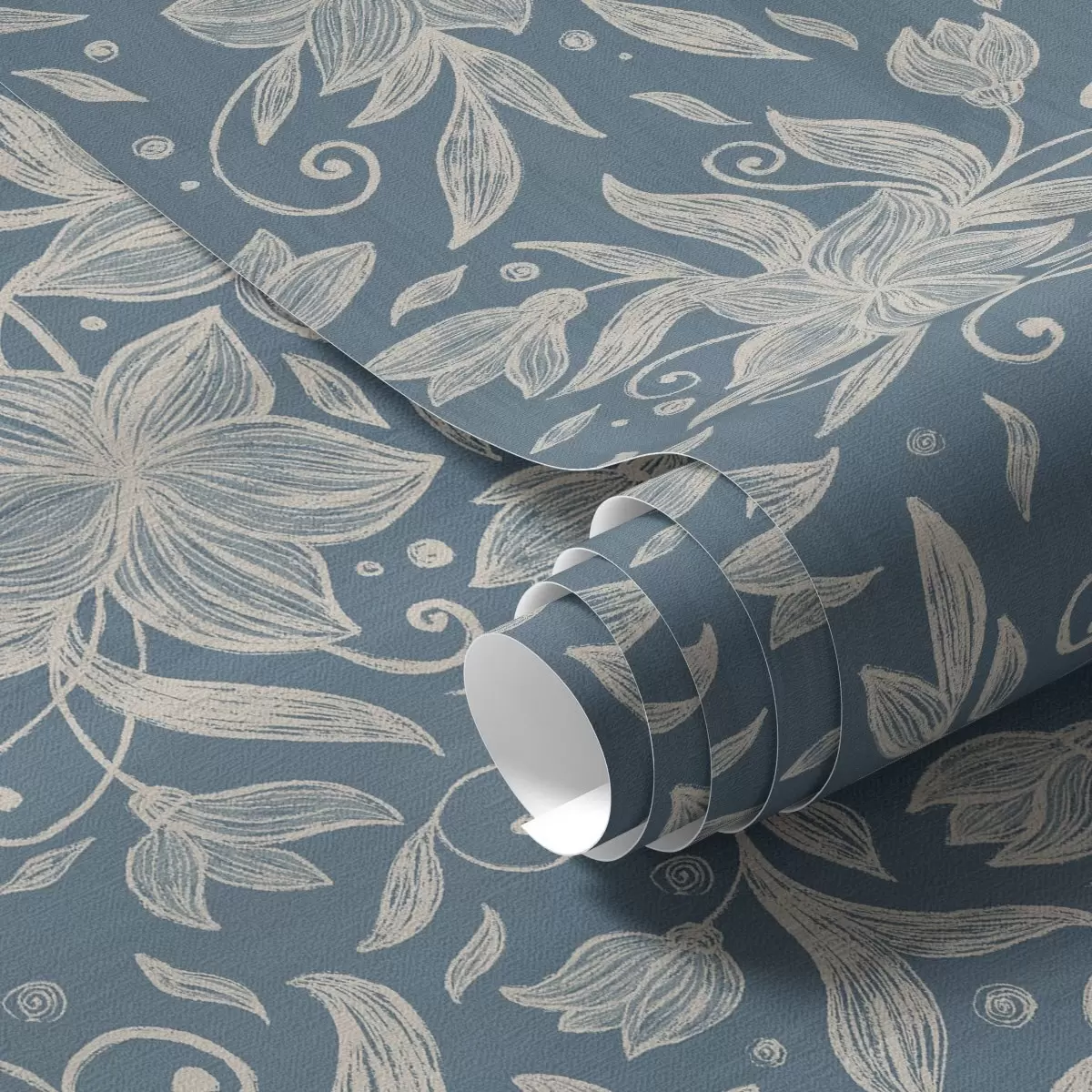Tapeta Krémové lineárne kvety na modrom pozadí, jemné špirály Nr. a00630