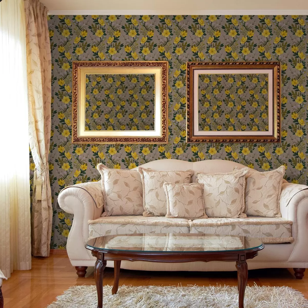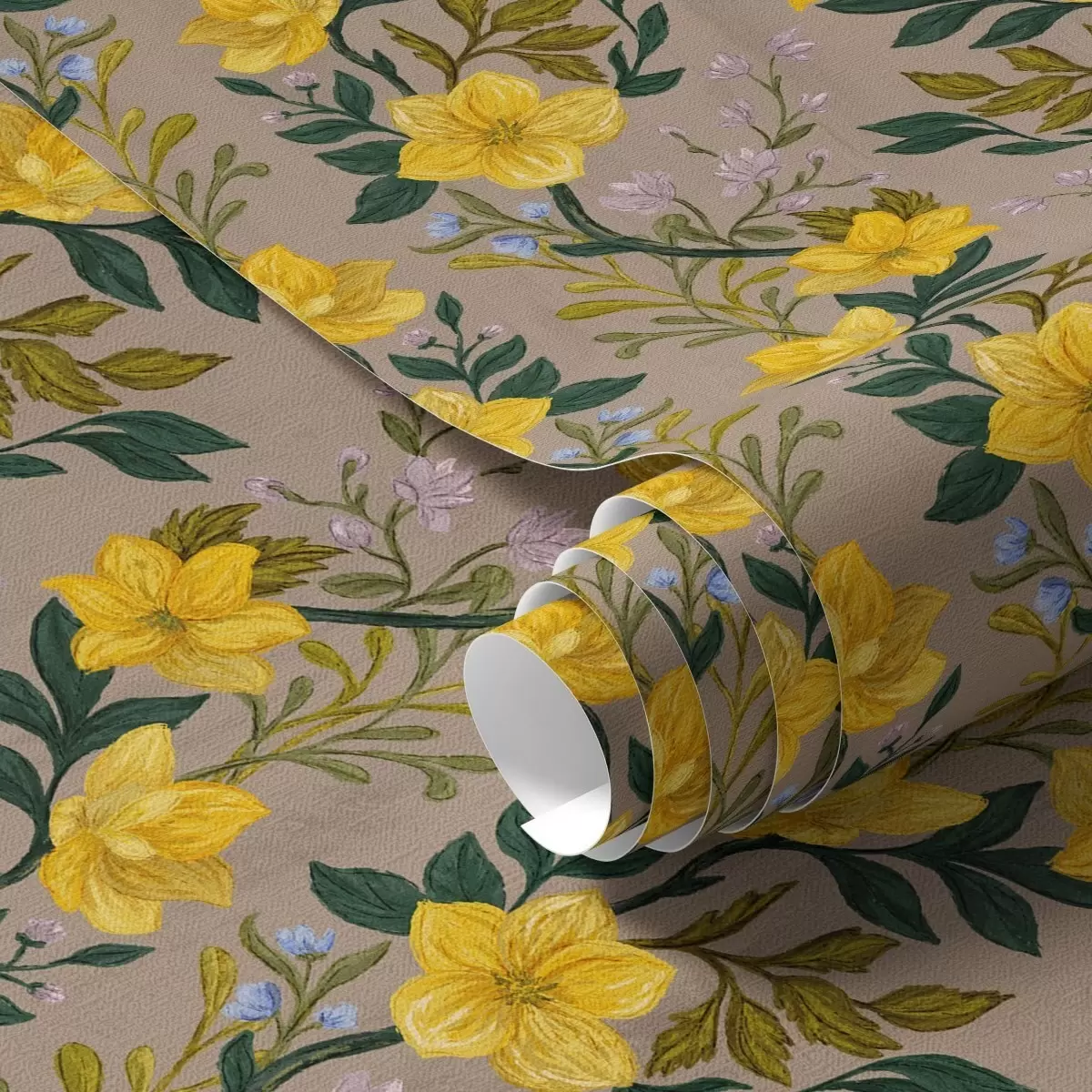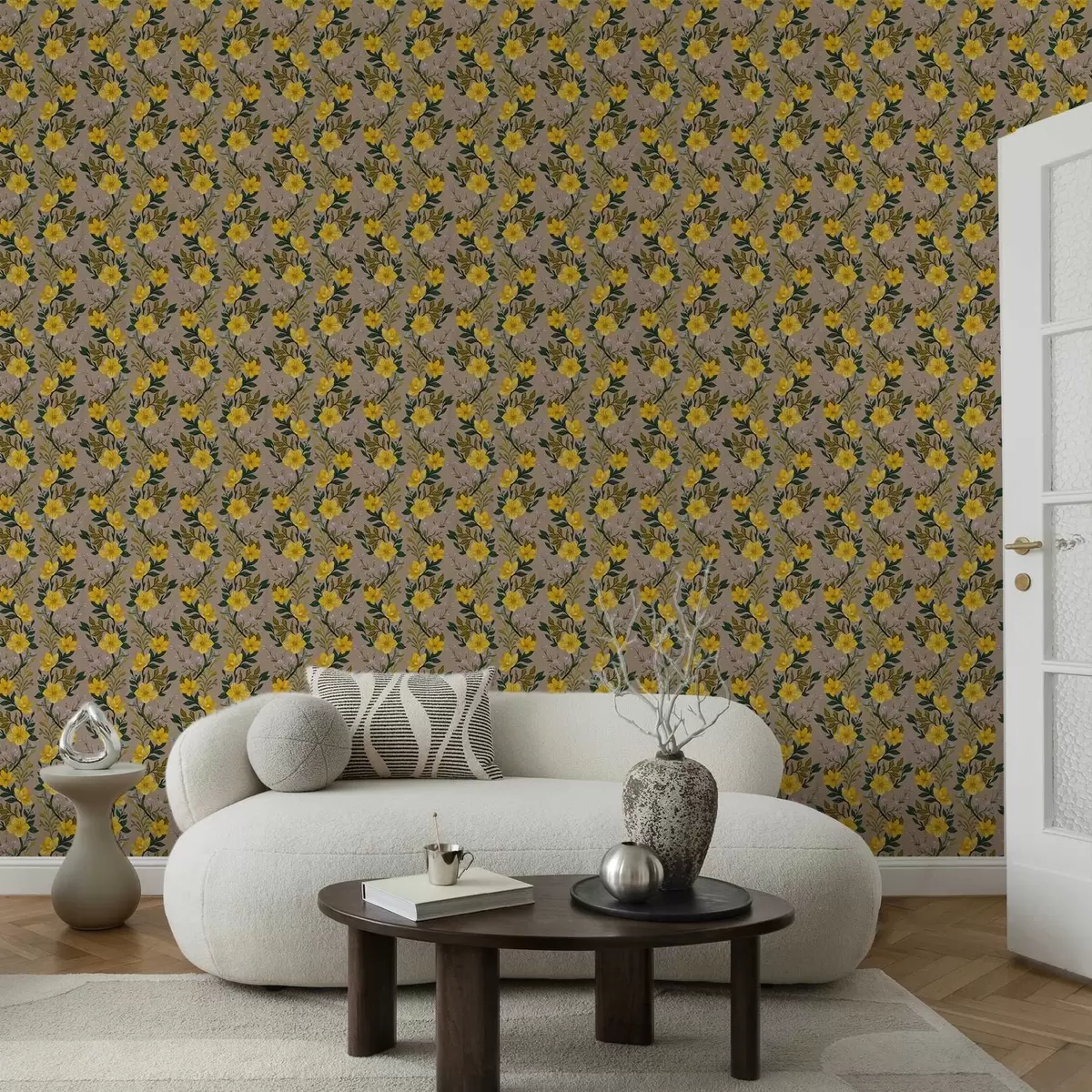 Tapeta Žlté kvety vo vertikálnych girlandách na sivohnedom pozadí Nr. a00632v1