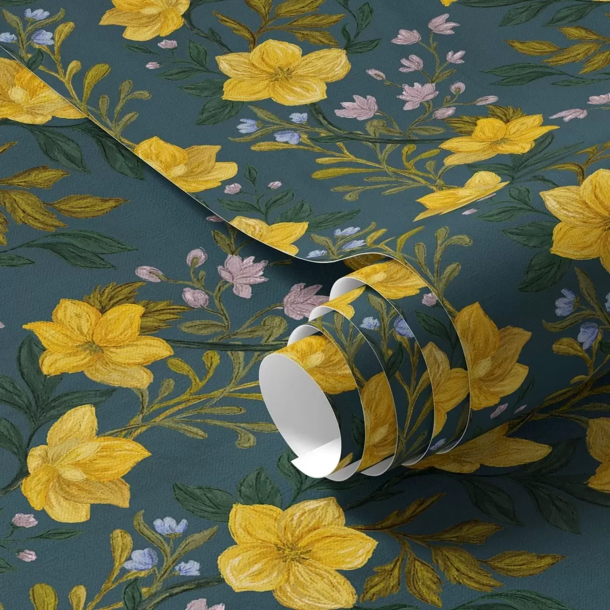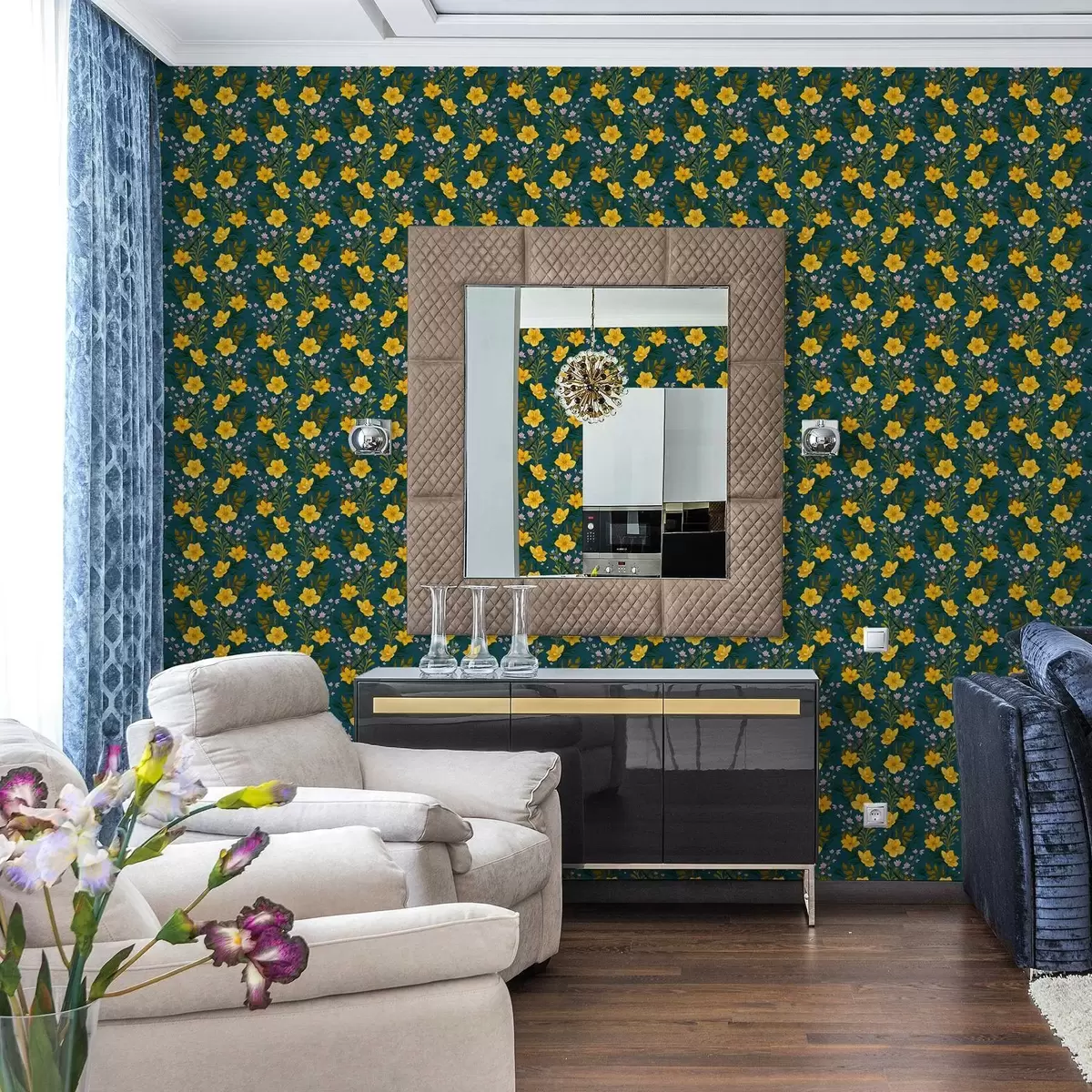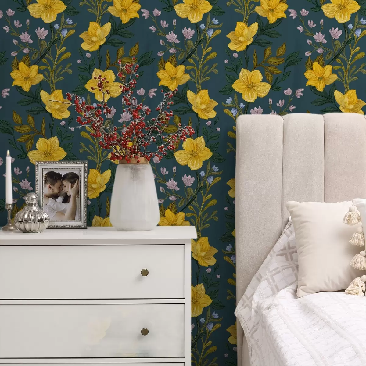 Tapeta Žlté kvety vo vertikálnych girlandách na tmavomodrom pozadí Nr. a00632v2
