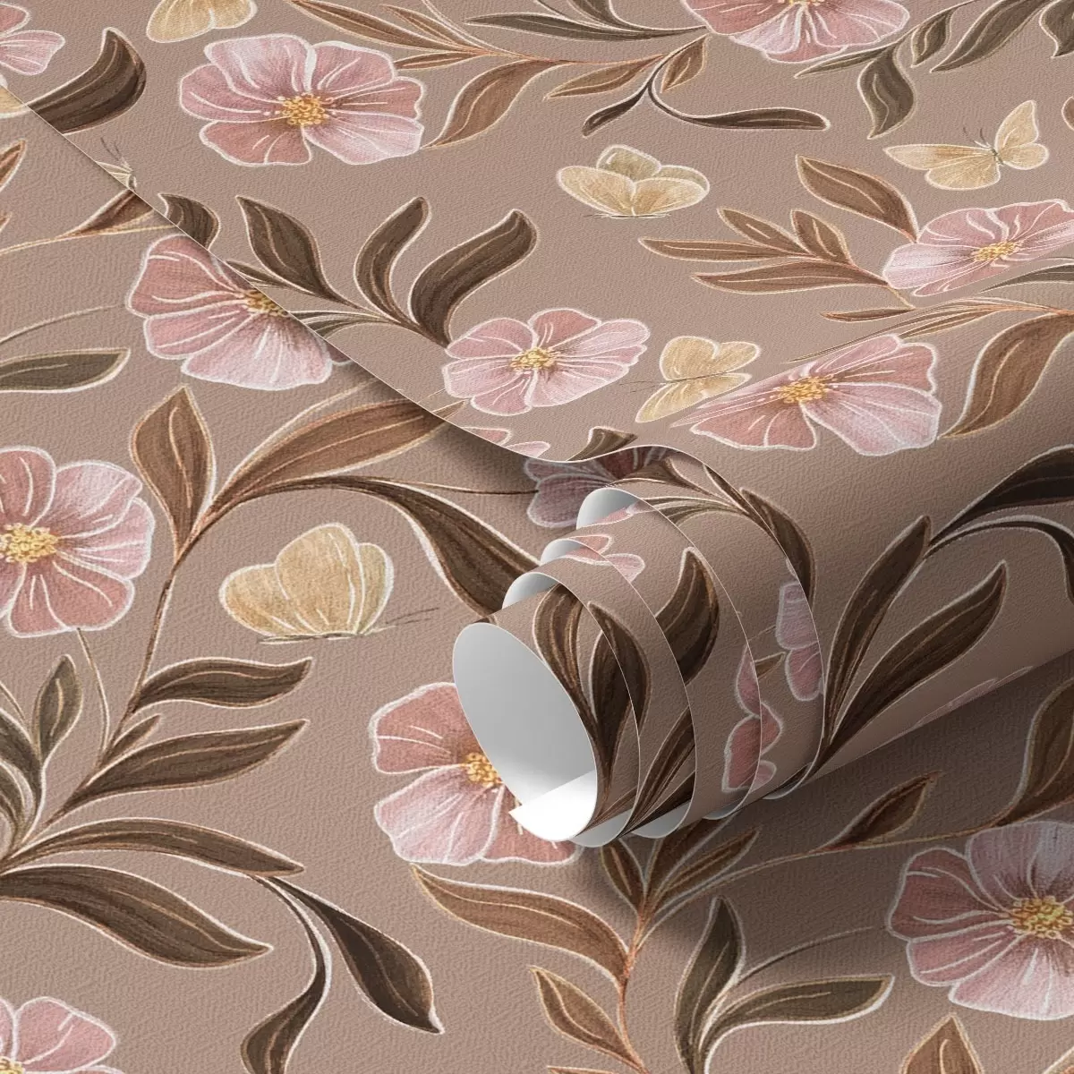 Tapeta Ružové kvety a motýle na teplom hnedom pozadí Nr. a00633v1