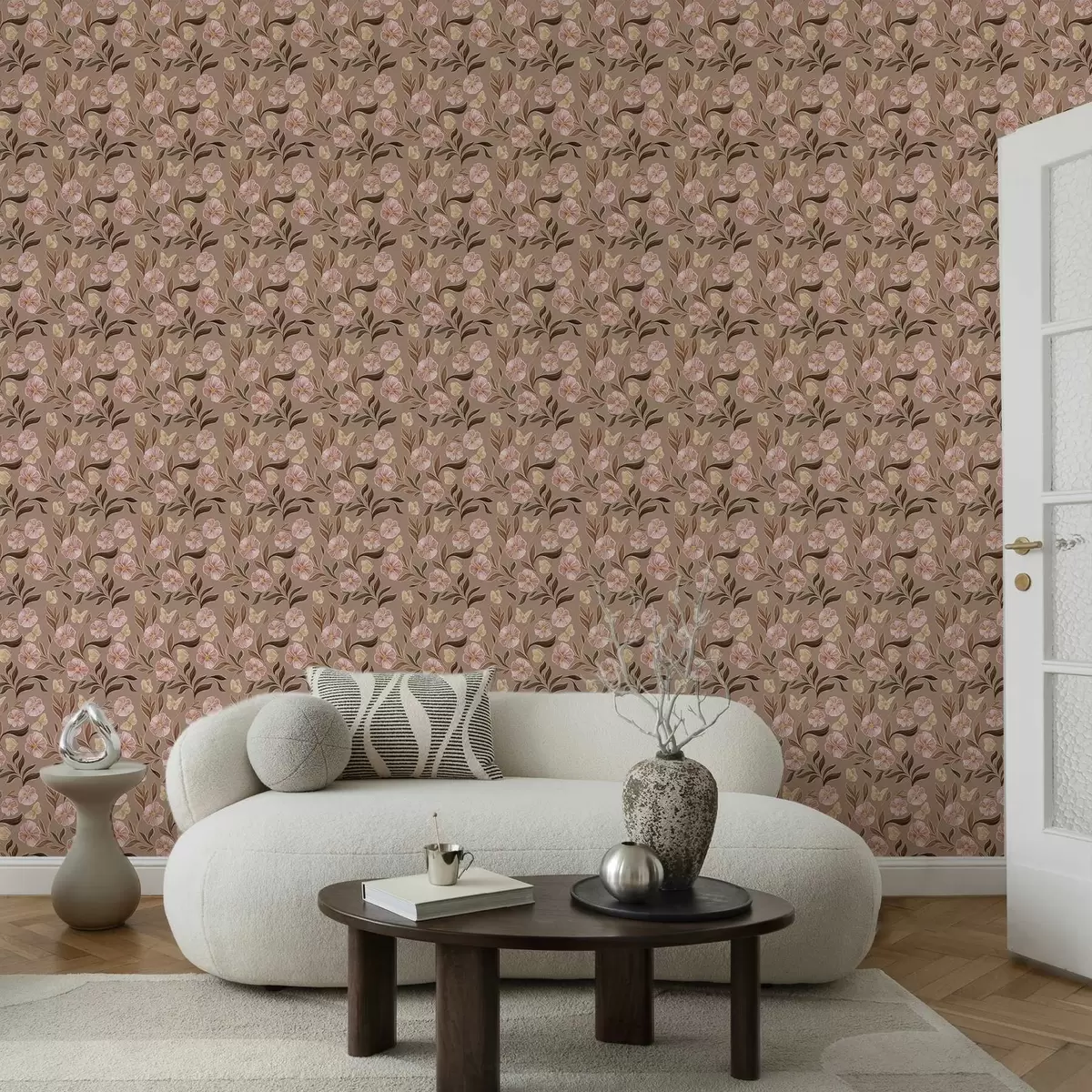 Tapeta Ružové kvety a motýle na teplom hnedom pozadí Nr. a00633v1