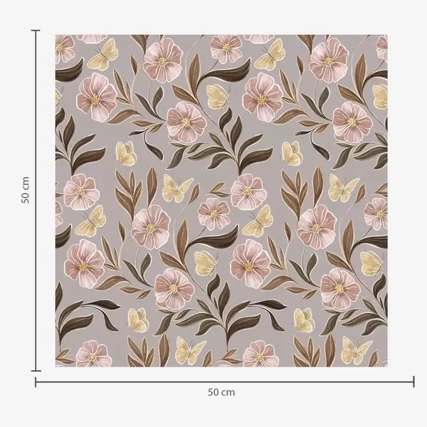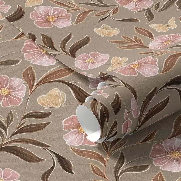 Tapeta Ružové kvety a motýle na olivovo-béžovom pozadí Nr. a00633v2