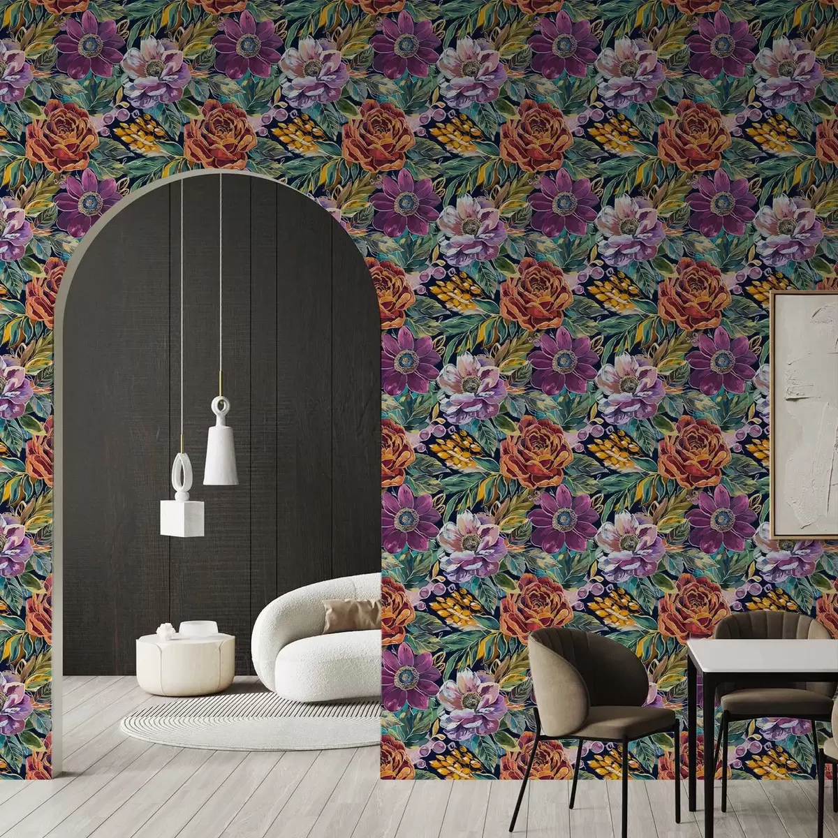 Tapeta Výrazné veľké kvety namaľované štetcom na tmavomodrom pozadí Nr. a00643