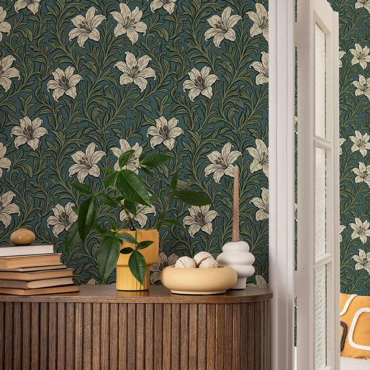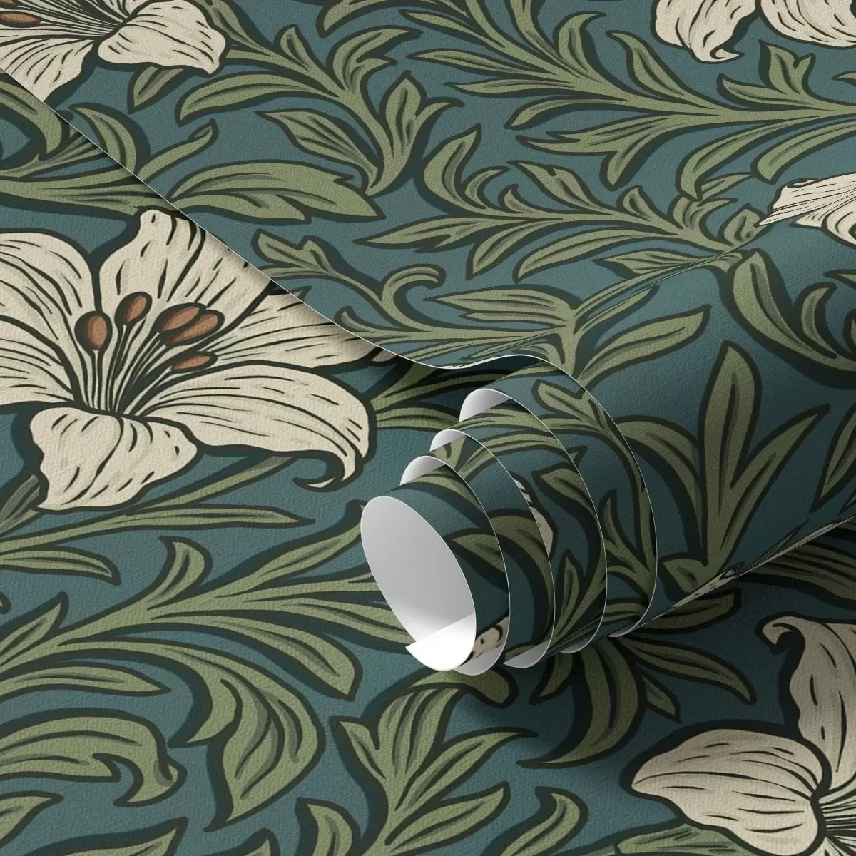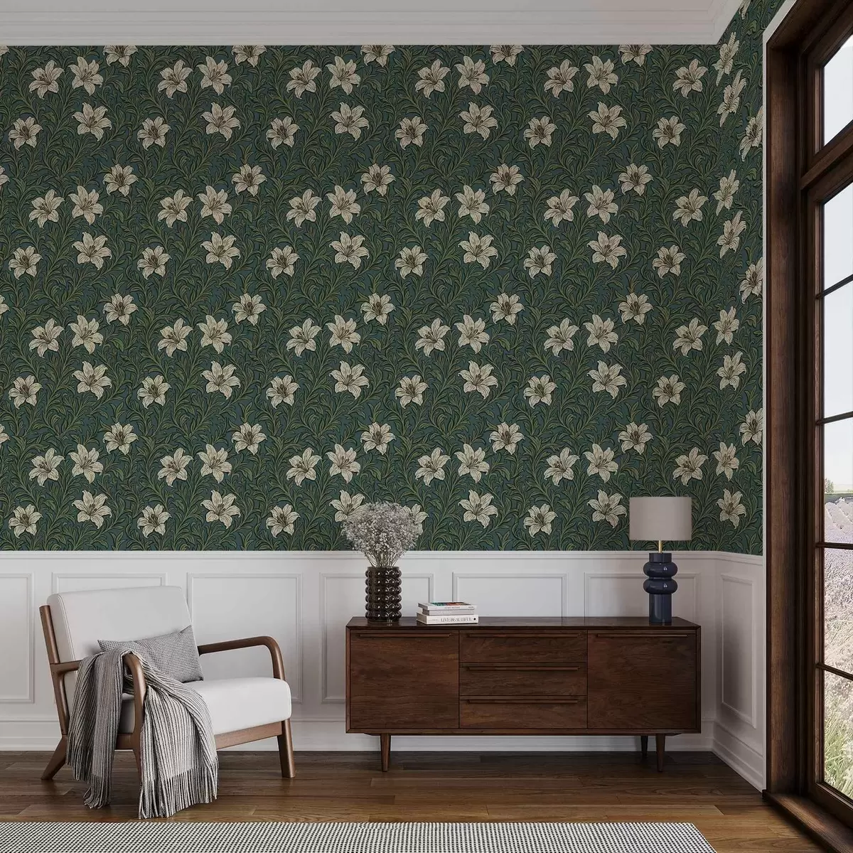 Tapeta Krémové ľalie medzi hustou zeleňou na tyrkysovom pozadí Nr. a00645