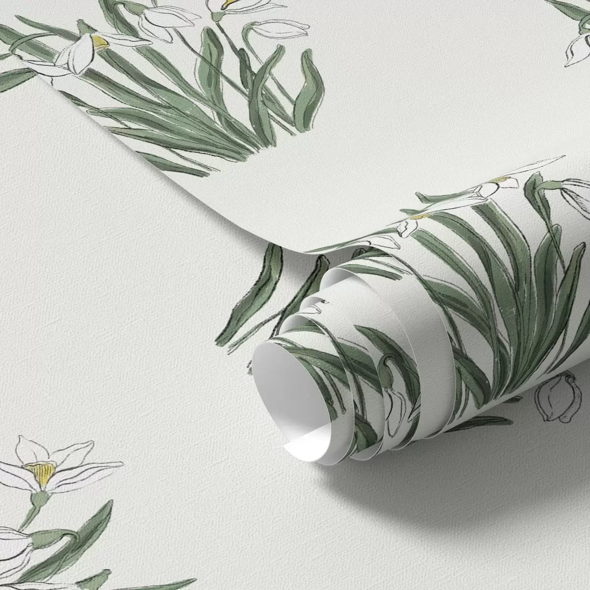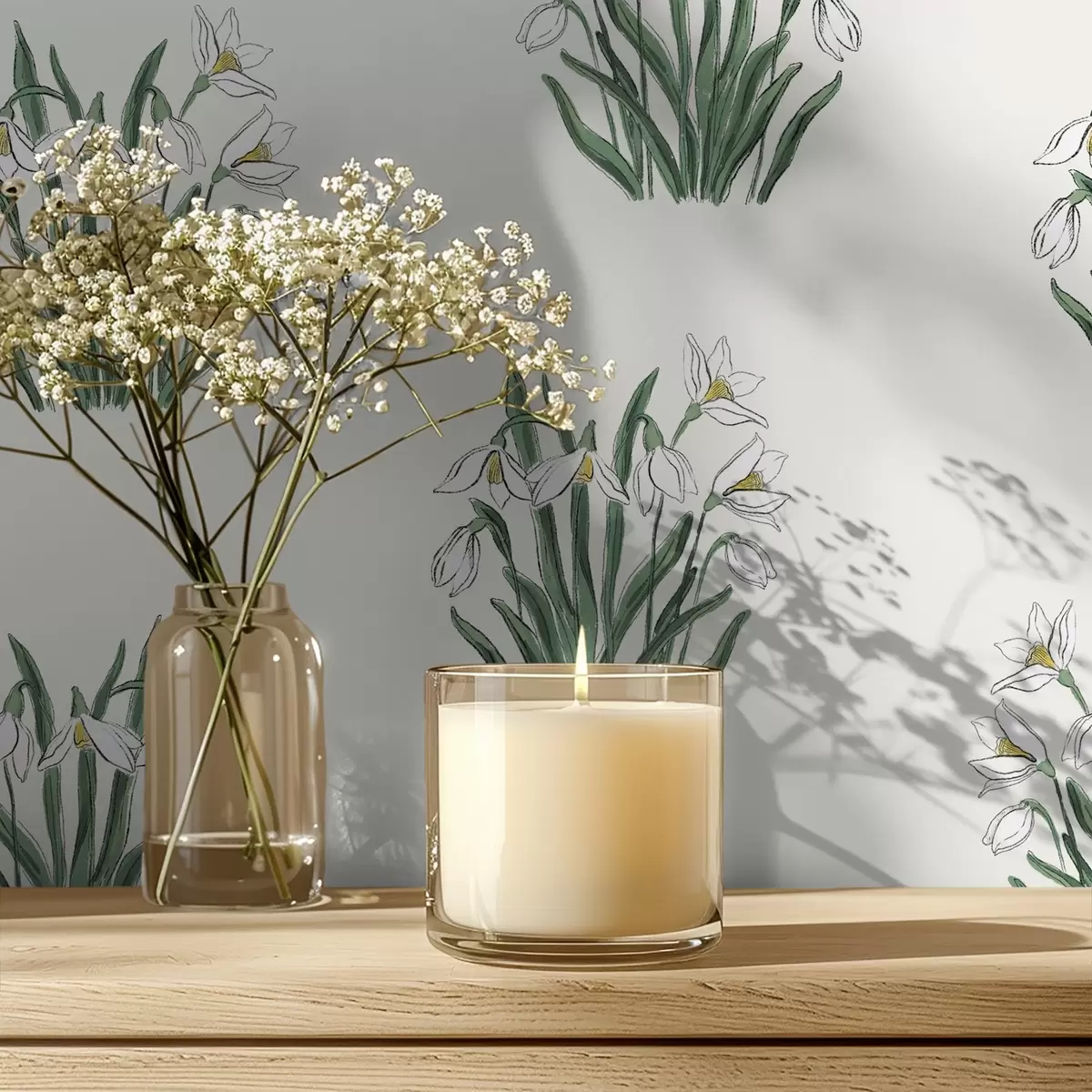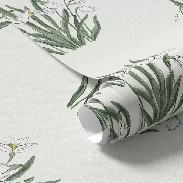 Tapeta Snežienky so zelenými listami na svetlošedom pozadí Nr. a00651v1