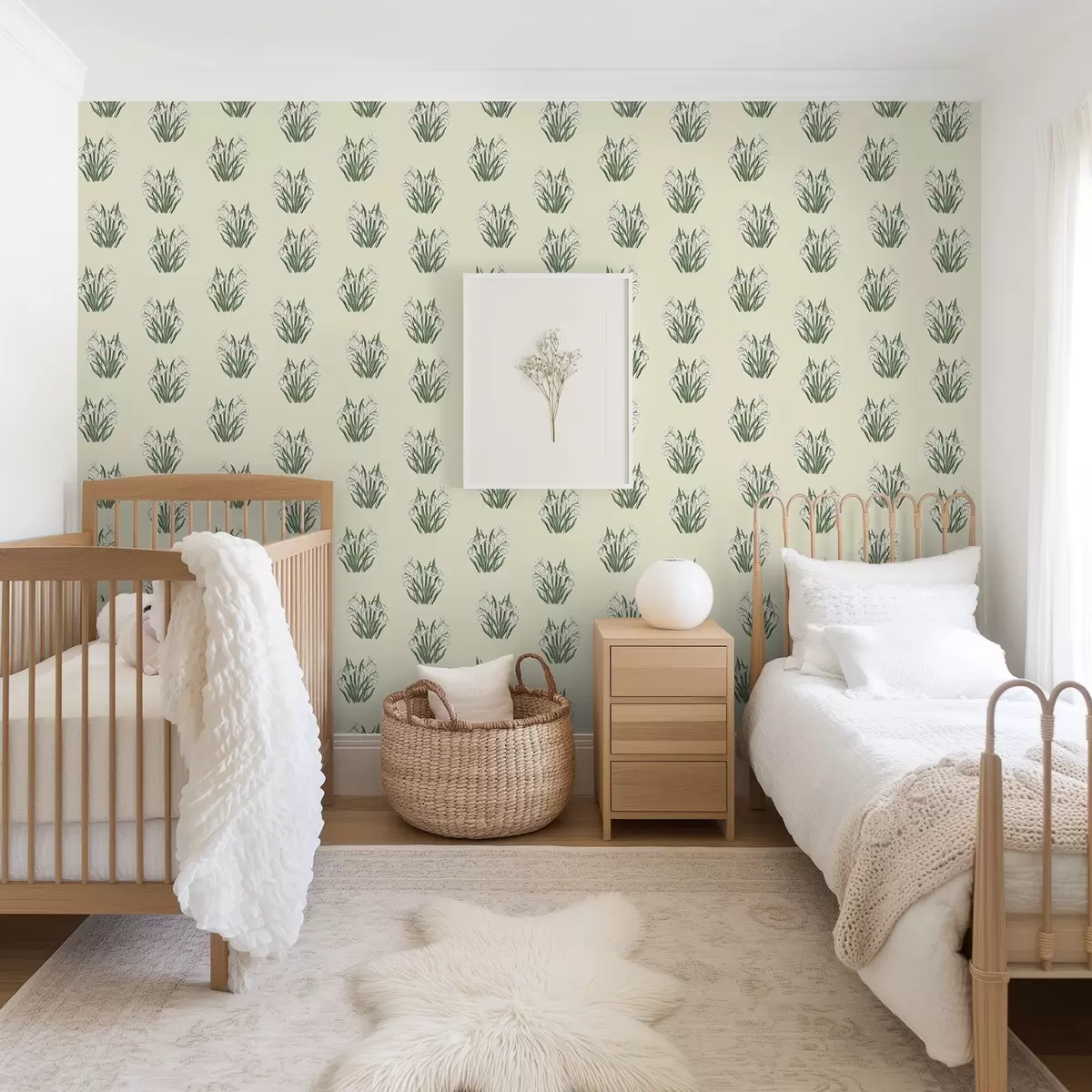 Tapeta Snežienky so zelenými listami na krémovom pozadí Nr. a00651v2