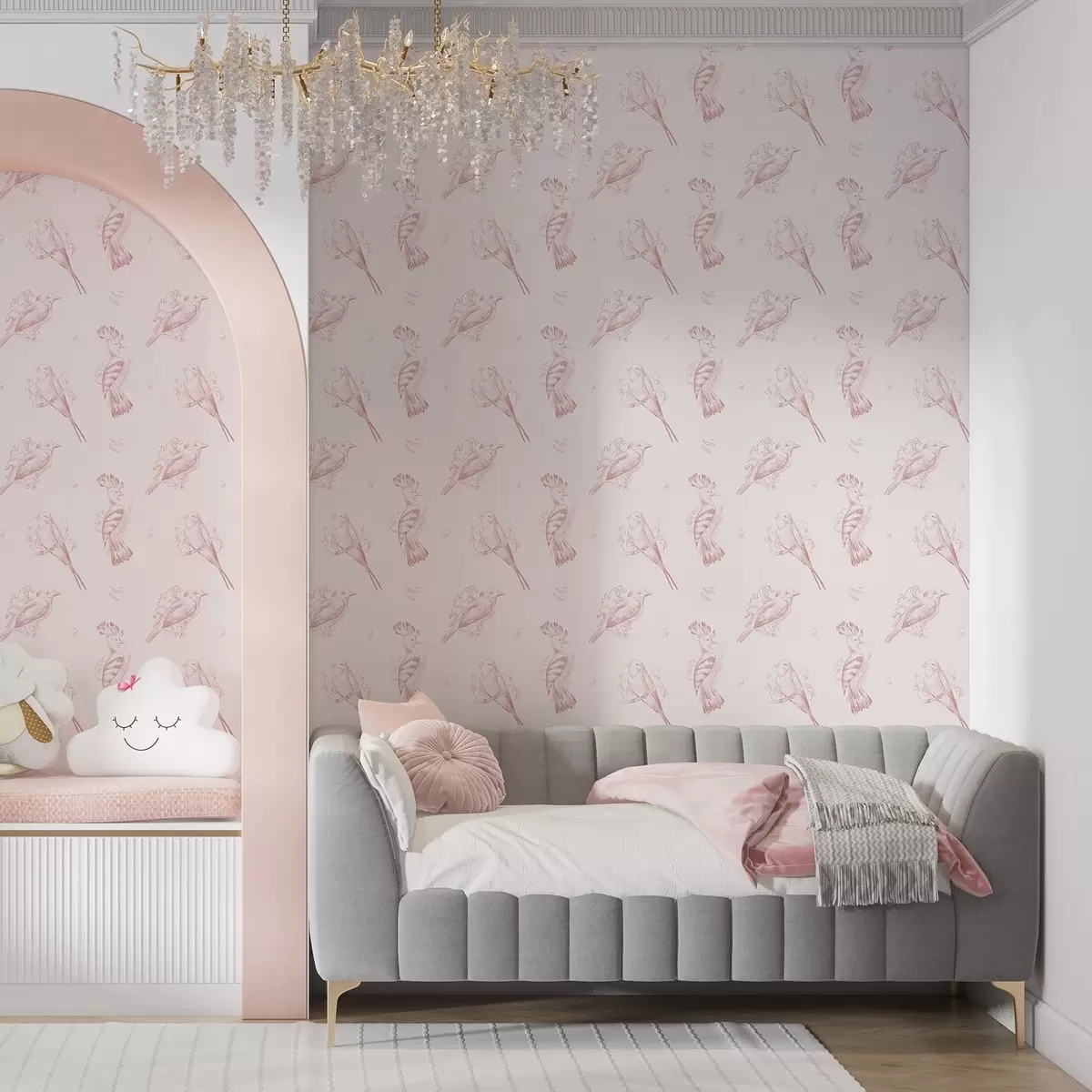 Tapeta Vtáčí toile: náčrt vtákov, jemné ružové pozadie Nr. a00656