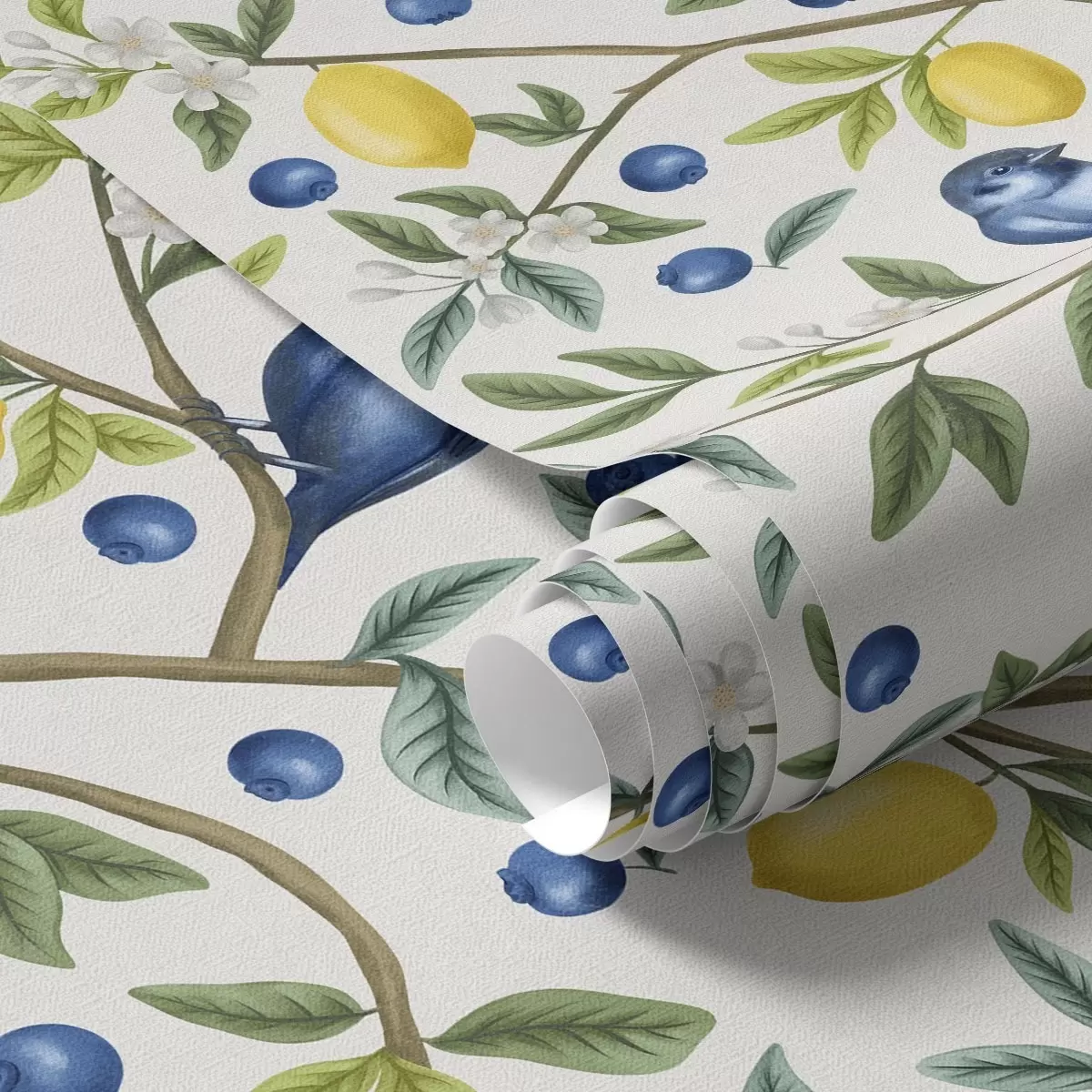 Tapeta Modré vtáky, citróny a bobule na bielom pozadí Nr. a00668