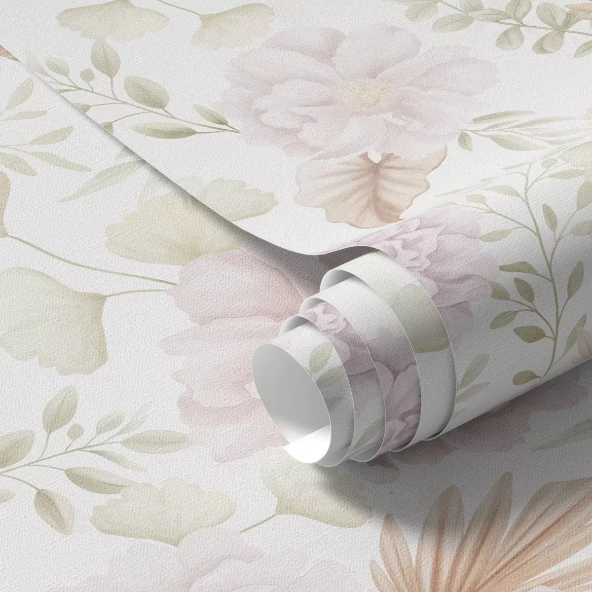 Tapeta Jemné pastelové pivonky a lístie na bielom pozadí Nr. a00669