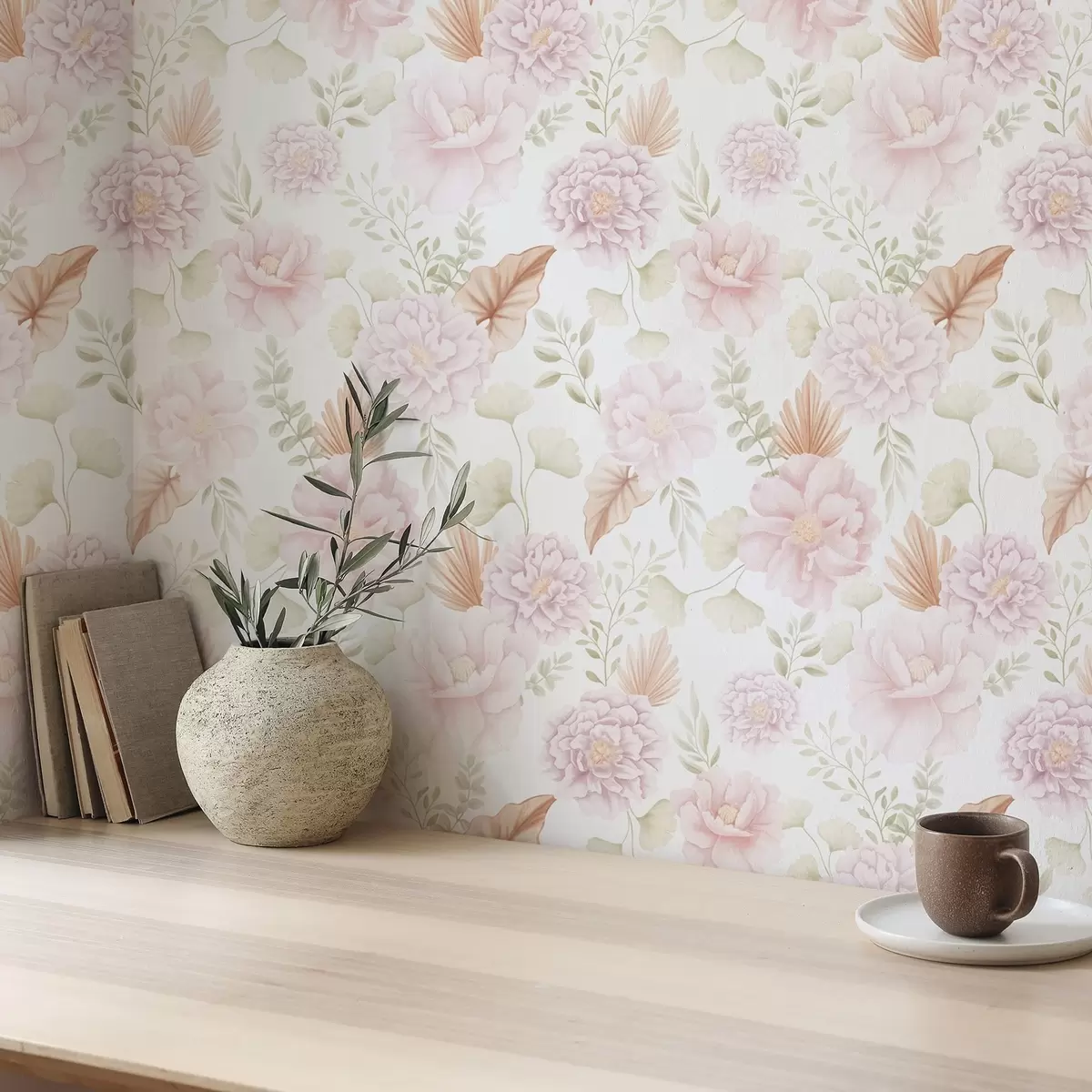Tapeta Jemné pastelové pivonky a lístie na bielom pozadí Nr. a00669