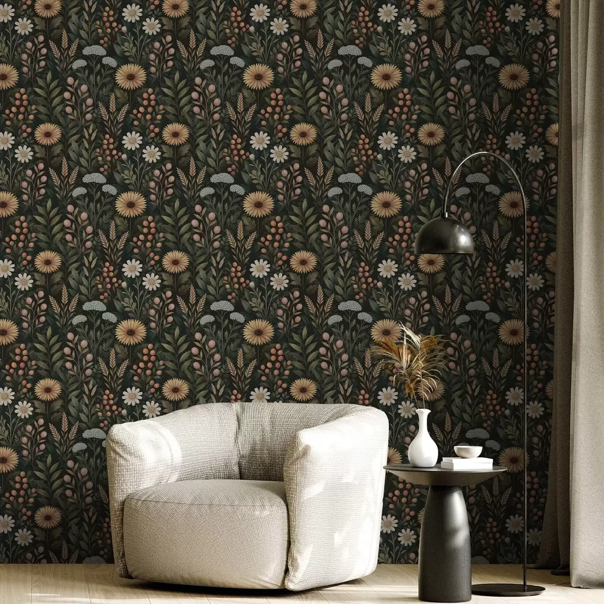 Tapeta Divoké kvety a bobule na tmavom pozadí, prírodný ornament Nr. a00707