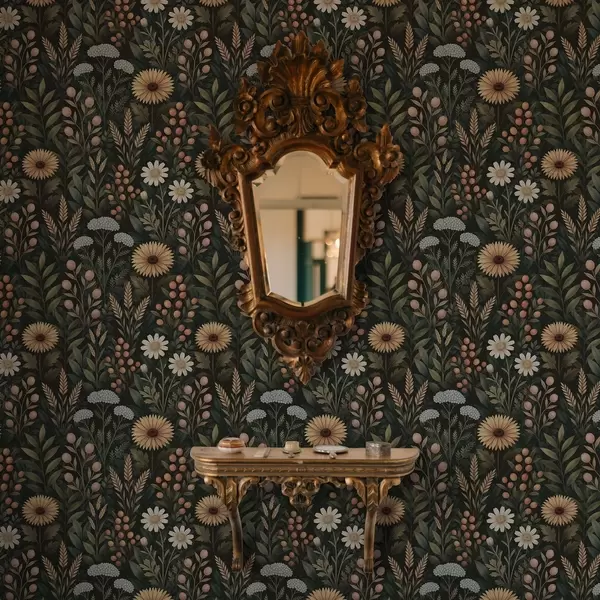 Tapeta Divoké kvety a bobule na tmavom pozadí, prírodný ornament Nr. a00707