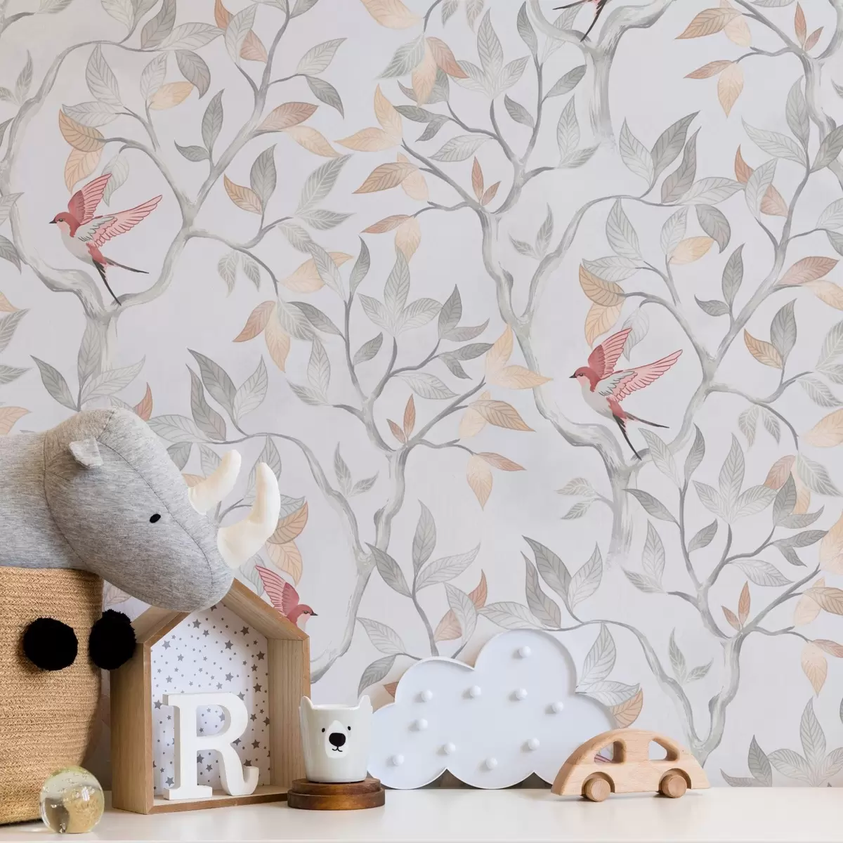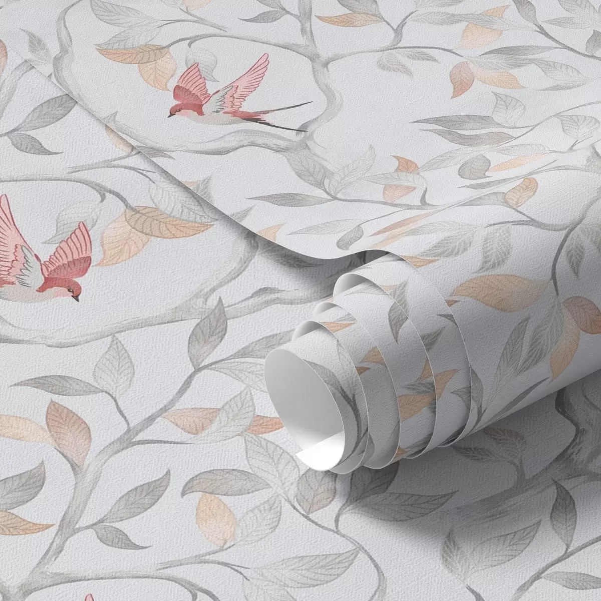 Tapeta Ľahké vetvy s listami a vtákmi v broskyňových odtieňoch Nr. a00716