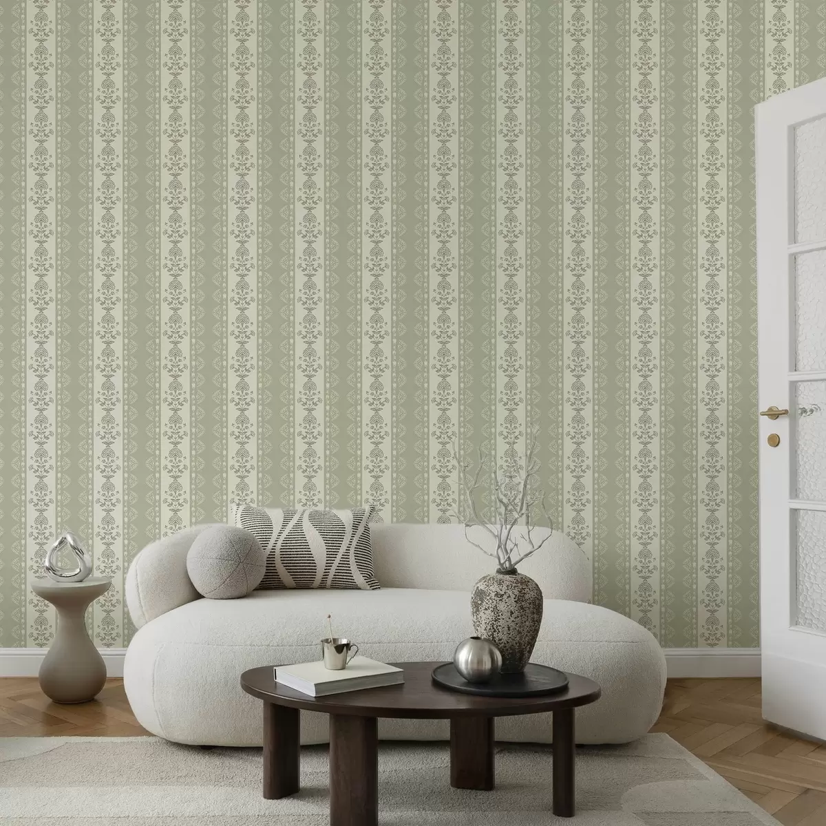 Tapeta Pruhovaný ornament s kvetinovými stĺpikmi v šalviových odtieňoch Nr. a00719