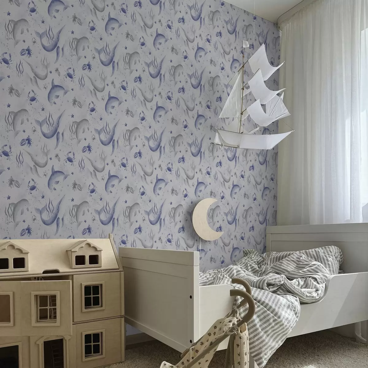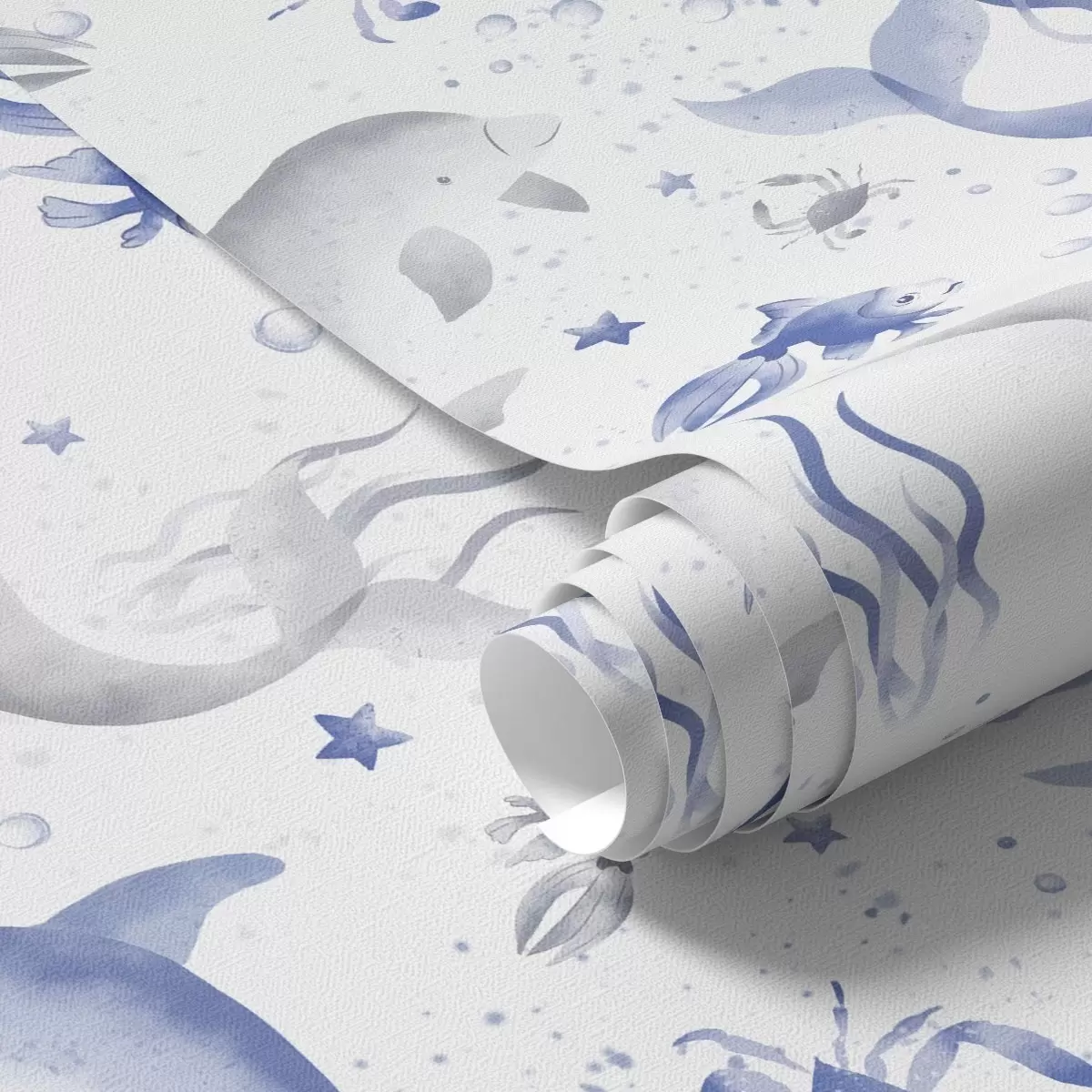 Tapeta Morské veľryby a delfíny v modrých odtieňoch na bielom pozadí Nr. a00720v1