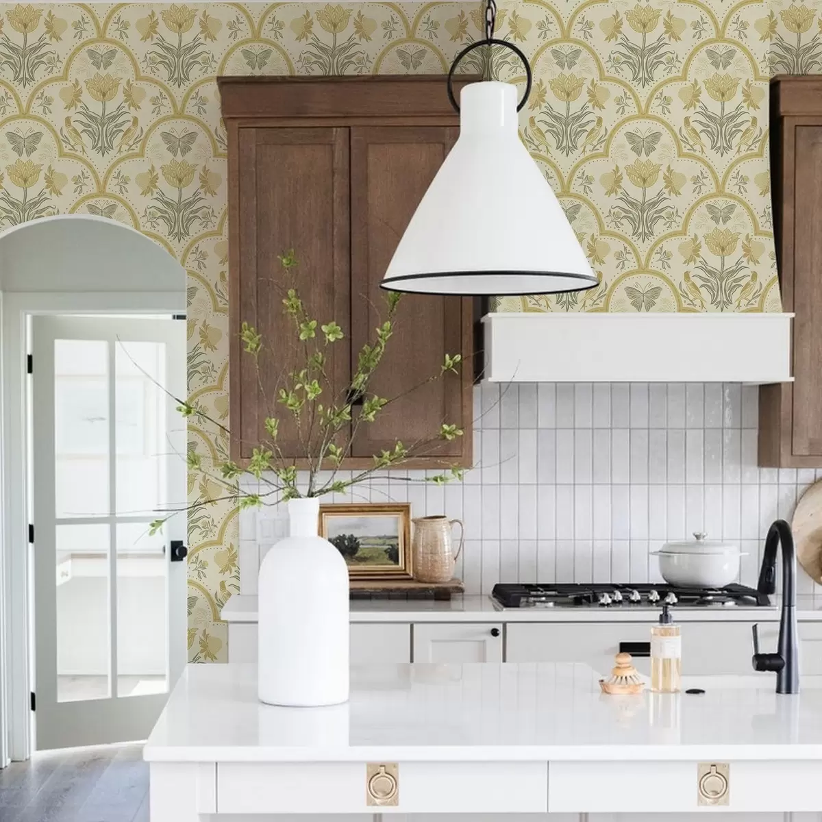 Tapeta Ozdoba s tulipánom, vtákmi a motýľmi, okrová Nr. a00722