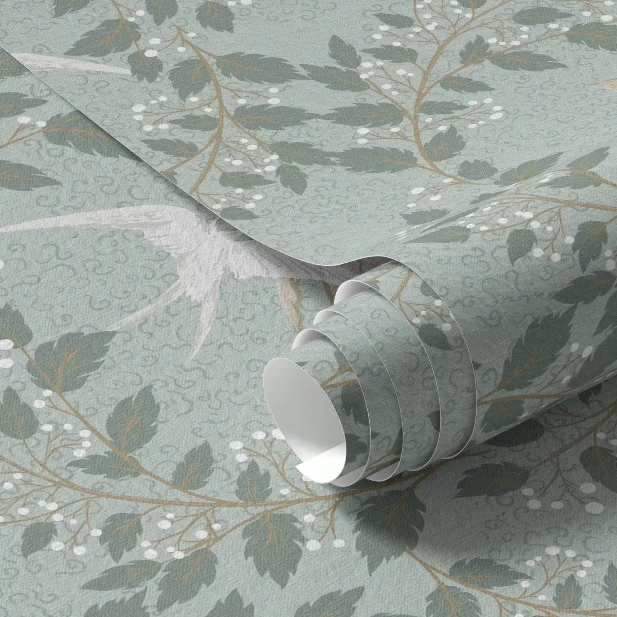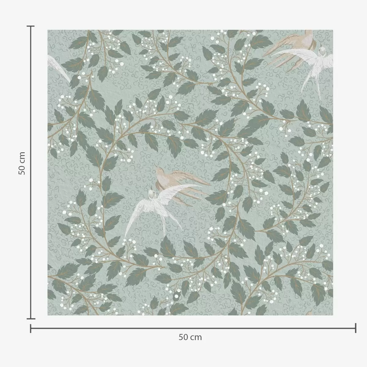 Tapeta Vetvy s bielymi bobuľami a vtákmi na zelenom pozadí Nr. a00731