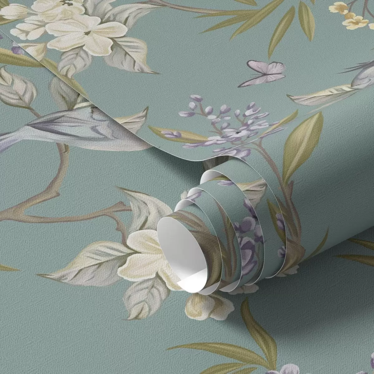 Tapeta Vtáky, kvety a motýle na modro-sivom pozadí Nr. a00735