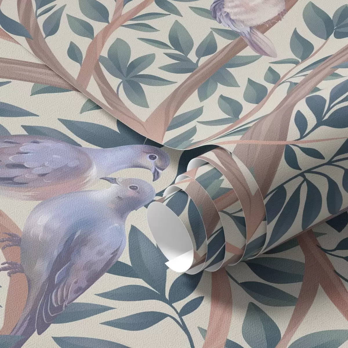 Tapeta Holubice medzi vetvami a listami v jemnej pastelovej palete Nr. a00796