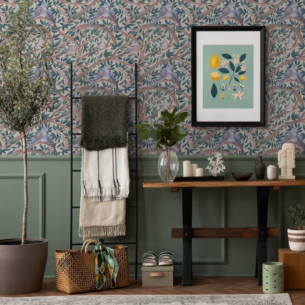Tapeta Holubice medzi vetvami a listami v jemnej pastelovej palete Nr. a00796