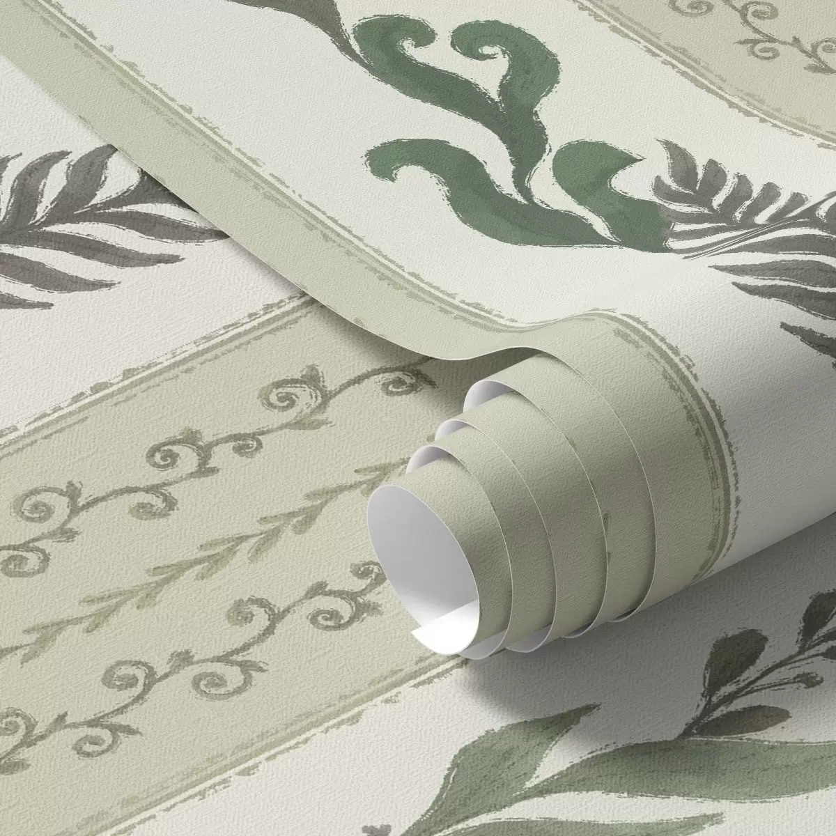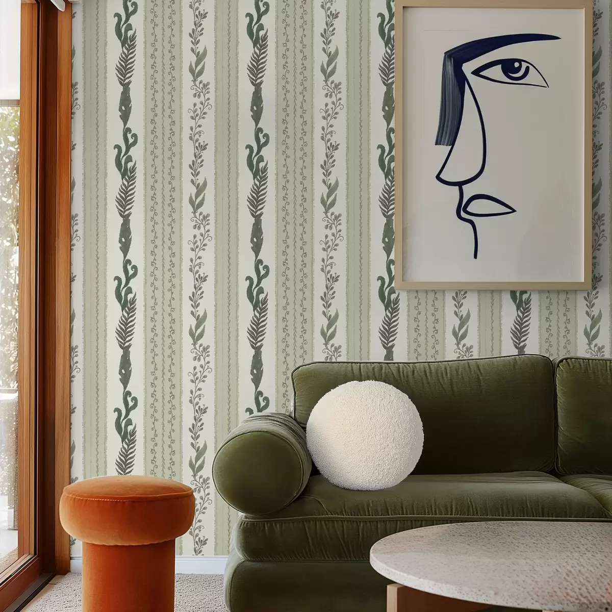 Tapeta Pruhy s vetvičkami v zelených a sivých odtieňoch, jemný kontrast Nr. a00824