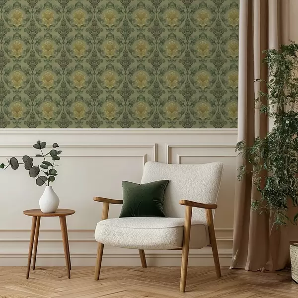Tapeta Damašek s rastlinnými ornamentmi, olivovo-okrová farebná paleta Nr. a00828