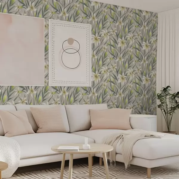 Tapeta Krémové ľalie s listami na šedo-béžovom pozadí Nr. a00837