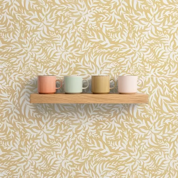 Tapeta Biely listový vzor na teplom okrovom pozadí, vírivý rytmus Nr. a00845